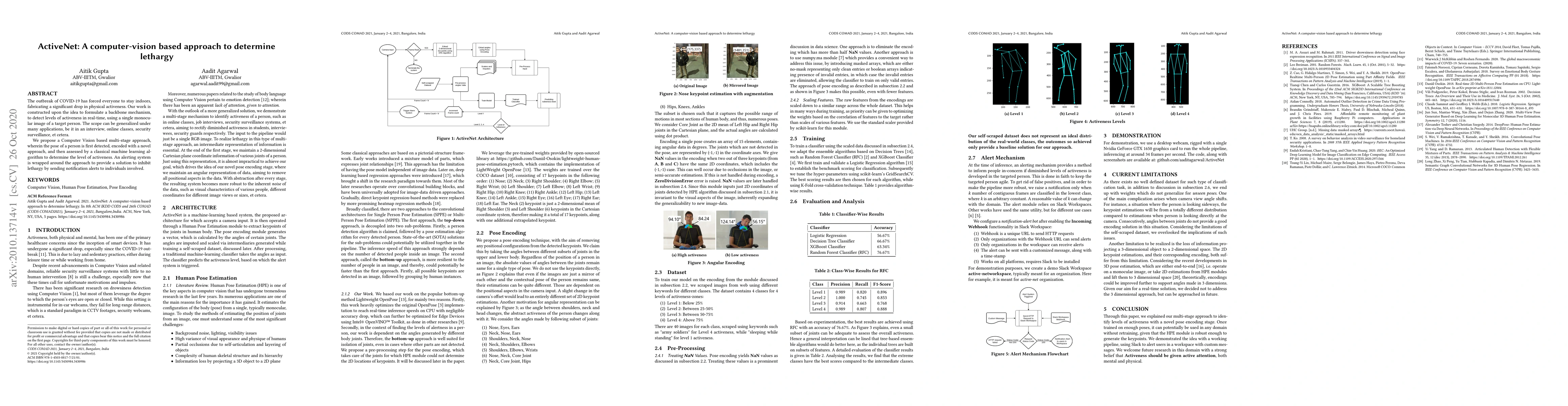 ActiveNet employs a computer-vision technique to detect real-time levels of physical activity from a single monocular image, using pose detection and machine learning to assess lethargy. An alerting system notifies individuals to counteract inactivity, applicable in various settings like interviews and surveillance.
