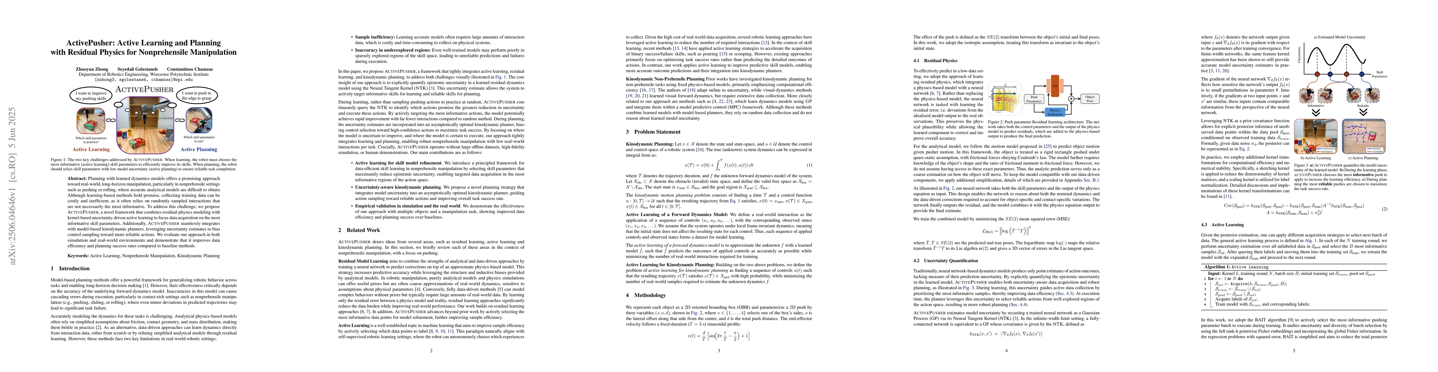 The paper introduces ActivePusher, a framework that combines residual physics modeling with active learning to optimize data collection for nonprehensile manipulation tasks like pushing or rolling. It improves data efficiency and planning success rates compared to traditional methods by focusing on the most informative skill parameters and integrating with model-based planners to bias control sampling toward reliable actions. The approach is validated through simulations and real-world experiments.
