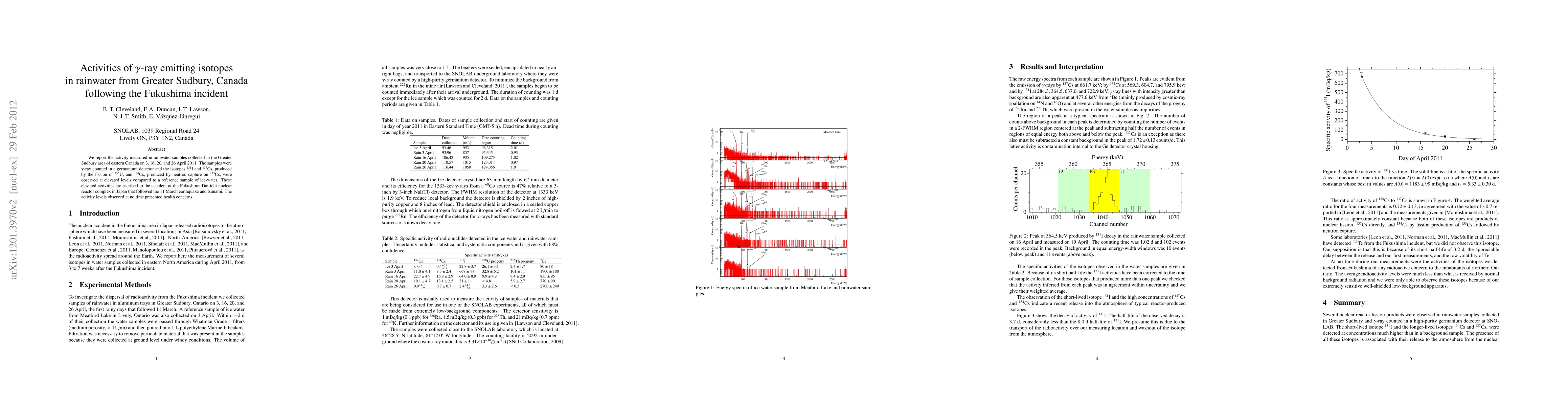 We report the activity measured in rainwater samples collected in the Greater Sudbury area of eastern Canada on 3, 16, 20, and 26 April 2011. The samples were gamma-ray counted in a germanium detector and the isotopes 131I and 137Cs, produced by the fission of 235U, and 134Cs, produced by neutron capture on 133Cs, were observed at elevated levels compared to a reference sample of ice-water. These elevated activities are ascribed to the accident at the Fukushima Dai-ichi nuclear reactor complex in Japan that followed the 11 March earthquake and tsunami. The activity levels observed at no time presented health concerns.