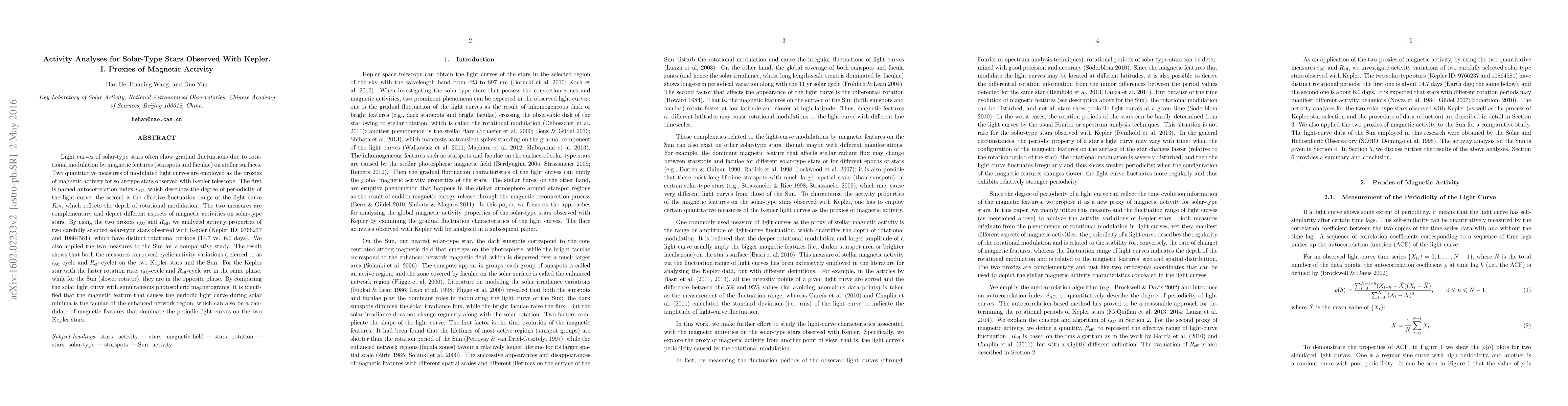 This paper introduces two quantitative measures, $i_{AC}$ and $R_{eff}$, to analyze magnetic activity in solar-type stars observed with Kepler. These measures reveal cyclic activity variations in two selected stars and the Sun, highlighting differences in magnetic feature dominance between faster and slower rotators.