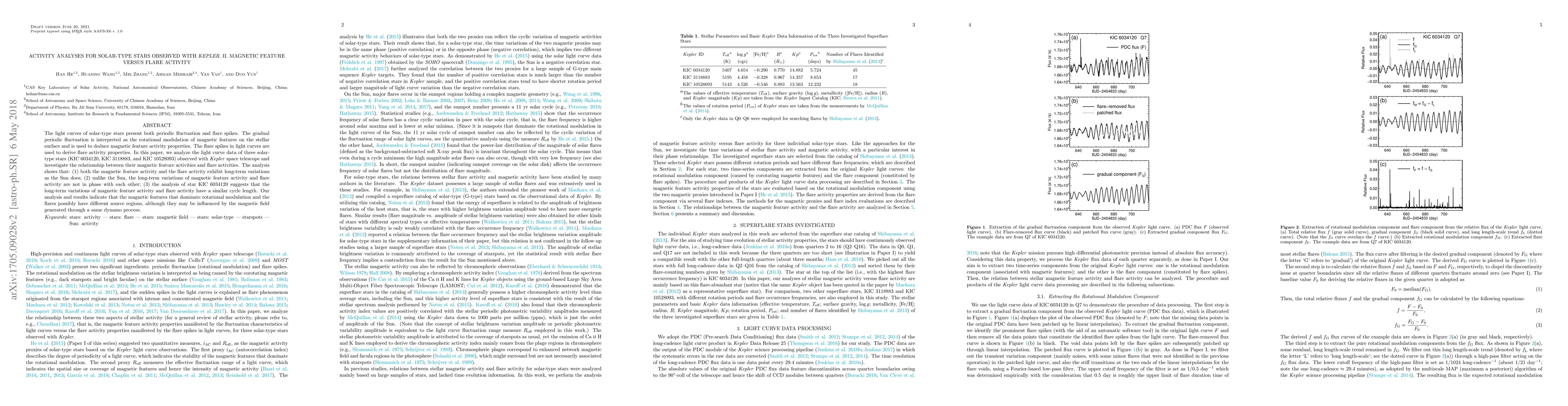 This paper analyzes Kepler light curve data of three solar-type stars to investigate the relationship between magnetic feature activity and flare activity, finding that while both exhibit long-term variations, their variations are out of phase and likely originate from different source regions.