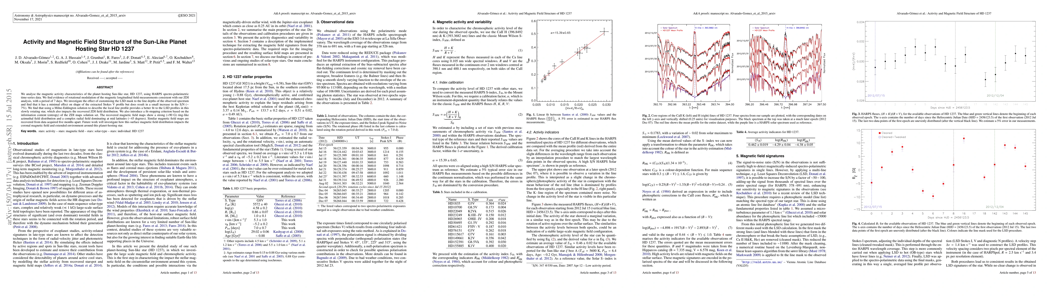 We analyse the magnetic activity characteristics of the planet hosting Sun-like star, HD 1237, using HARPS spectro-polarimetric time-series data. We find evidence of rotational modulation of the magnetic longitudinal field measurements consistent with our ZDI analysis, with a period of 7 days. We investigate the effect of customising the LSD mask to the line depths of the observed spectrum and find that it has a minimal effect on shape of the extracted Stokes V profile but does result in a small increase in the S/N ($\sim$ 7%). We find that using a Milne-Eddington solution to describe the local line profile provides a better fit to the LSD profiles in this slowly rotating star, which also impacts the recovered ZDI field distribution. We also introduce a fit-stopping criterion based on the information content (entropy) of the ZDI maps solution set. The recovered magnetic field maps show a strong (+90 G) ring-like azimuthal field distribution and a complex radial field dominating at mid latitudes ($\sim$45 degrees). Similar magnetic field maps are recovered from data acquired five months apart. Future work will investigate how this surface magnetic field distribution impacts the coronal magnetic field and extended environment around this planet-hosting star.