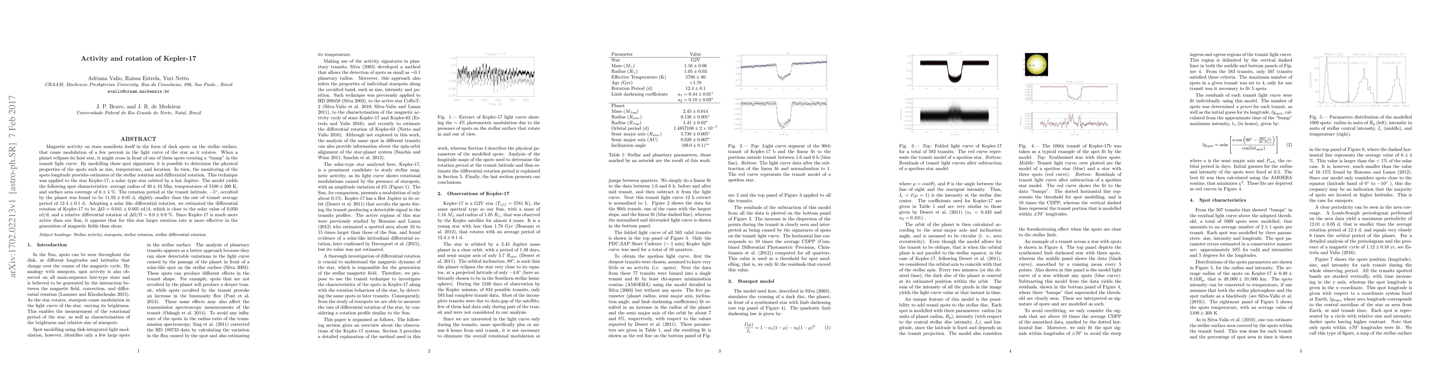 Magnetic activity on stars manifests itself in the form of dark spots on the stellar surface, that cause modulation of a few percent in the light curve of the star as it rotates. When a planet eclipses its host star, it might cross in front of one of these spots creating a "bump" in the transit light curve. By modelling these spot signatures, it is possible to determine the physical properties of the spots such as size, temperature, and location. In turn, the monitoring of the spots longitude provides estimates of the stellar rotation and differential rotation. This technique was applied to the star Kepler-17, a solar--type star orbited by a hot Jupiter. The model yields the following spot characteristics: average radius of $49 \pm 10$ Mm, temperatures of $5100 \pm 300$ K, and surface area coverage of $6 \pm 4$ \%. The rotation period at the transit latitude, $-5^\circ$, occulted by the planet was found to be $11.92 \pm 0.05$ d, slightly smaller than the out--of--transit average period of $12.4 \pm 0.1$ d. Adopting a solar like differential rotation, we estimated the differential rotation of Kepler-17 to be $\Delta\Omega = 0.041 \pm 0.005$ rd/d, which is close to the solar value of 0.050 rd/d, and a relative differential rotation of $\Delta\Omega/\Omega=8.0 \pm 0.9$ \%. Since Kepler-17 is much more active than our Sun, it appears that for this star larger rotation rate is more effective in the generation of magnetic fields than shear.