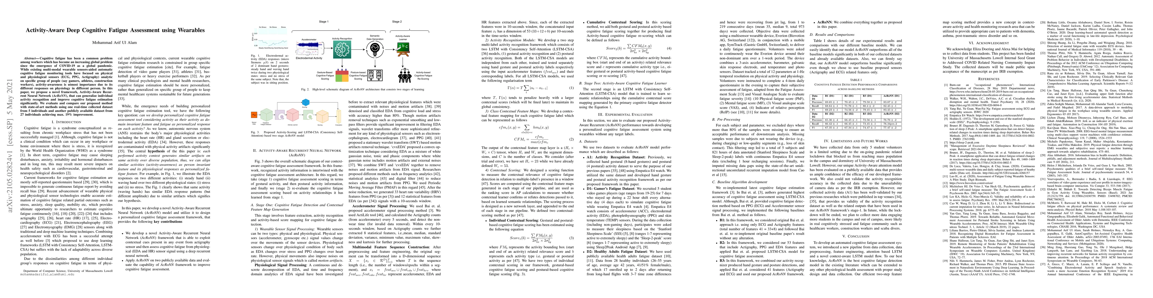 Cognitive fatigue has been a common problem among workers which has become an increasing global problem since the emergence of COVID-19 as a global pandemic. While existing multi-modal wearable sensors-aided automatic cognitive fatigue monitoring tools have focused on physical and physiological sensors (ECG, PPG, Actigraphy) analytic on specific group of people (say gamers, athletes, construction workers), activity-awareness is utmost importance due to its different responses on physiology in different person. In this paper, we propose a novel framework, Activity-Aware Recurrent Neural Network (\emph{AcRoNN}), that can generalize individual activity recognition and improve cognitive fatigue estimation significantly. We evaluate and compare our proposed method with state-of-art methods using one real-time collected dataset from 5 individuals and another publicly available dataset from 27 individuals achieving max. 19% improvement.
