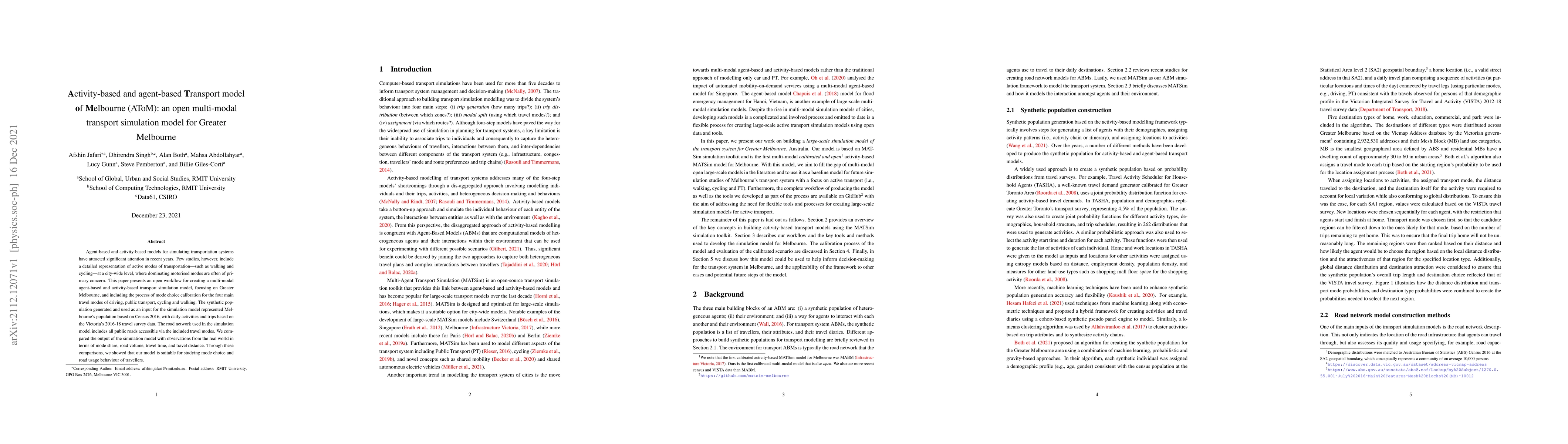 This paper introduces an open multi-modal transport simulation model for Greater Melbourne, incorporating agent-based and activity-based approaches to simulate travel modes including walking and cycling. The model's calibration and validation against real-world data demonstrate its effectiveness in studying mode choice and travel behavior.