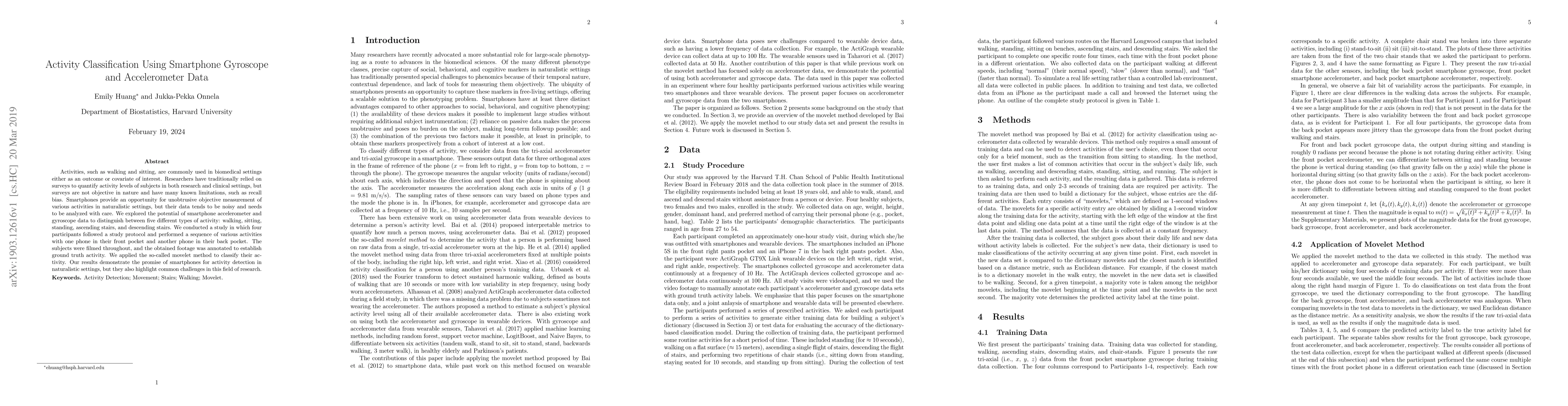 Activities, such as walking and sitting, are commonly used in biomedical settings either as an outcome or covariate of interest. Researchers have traditionally relied on surveys to quantify activity levels of subjects in both research and clinical settings, but surveys are not objective in nature and have many known limitations, such as recall bias. Smartphones provide an opportunity for unobtrusive objective measurement of various activities in naturalistic settings, but their data tends to be noisy and needs to be analyzed with care. We explored the potential of smartphone accelerometer and gyroscope data to distinguish between five different types of activity: walking, sitting, standing, ascending stairs, and descending stairs. We conducted a study in which four participants followed a study protocol and performed a sequence of various activities with one phone in their front pocket and another phone in their back pocket. The subjects were filmed throughout, and the obtained footage was annotated to establish ground truth activity. We applied the so-called movelet method to classify their activity. Our results demonstrate the promise of smartphones for activity detection in naturalistic settings, but they also highlight common challenges in this field of research.