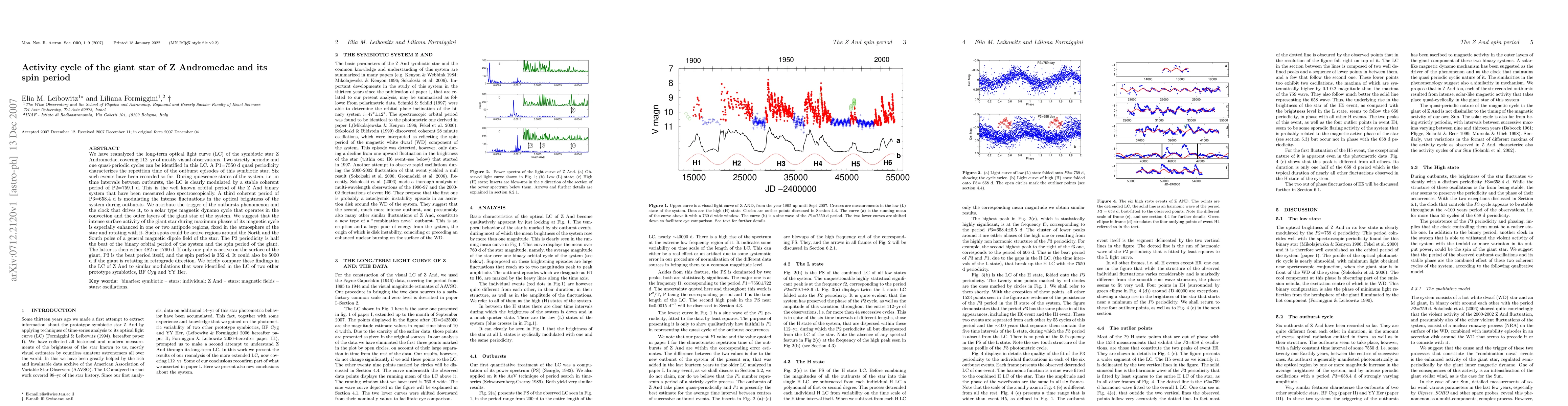 We have reanalyzed the long-term optical light curve (LC) of the symbiotic star Z Andromedae, covering 112--yr of mostly visual observations. Two strictly periodic and one quasi-periodic cycles can be identified in this LC. A P1=7550 d quasi periodicity characterizes the repetition time of the outburst episodes of this symbiotic star. Six such events have been recorded so far. During quiescence states of the system, i.e. in time intervals between outbursts, the LC is clearly modulated by a stable coherent period of P2=759.1 d. This is the well known orbital period of the Z And binary system that have been measured also spectroscopically. A third coherent period of P3=658.4 d is modulating the intense fluctuations in the optical brightness of the system during outbursts. We attribute the trigger of the outbursts phenomenon and the clock that drives it, to a solar type magnetic dynamo cycle that operates in the convection and the outer layers of the giant star of the system. We suggest that the intense surface activity of the giant star during maximum phases of its magnetic cycle is especially enhanced in one or two antipode regions, fixed in the atmosphere of the star and rotating with it. Such spots could be active regions around the North and the South poles of a general magnetic dipole field of the star. The P3 periodicity is half the beat of the binary orbital period of the system and the spin period of the giant. The latter is then either 482 or 1790 d. If only one pole is active on the surface of the giant, P3 is the beat period itself, and the spin period is 352 d. It could also be 5000 d if the giant is rotating in retrograde direction. We briefly compare these findings in the LC of Z And to similar modulations that were identified in the LC of two other prototype symbiotics, BF Cyg and YY Her.
