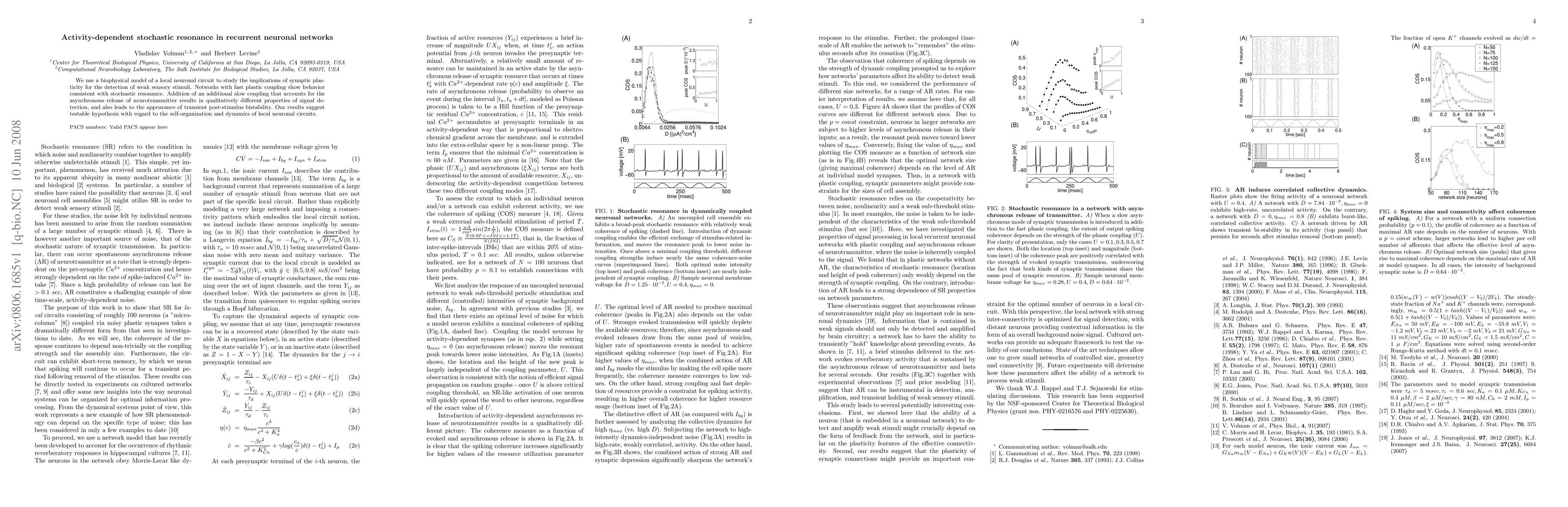 This paper explores how synaptic plasticity in recurrent neuronal networks enhances the detection of weak sensory stimuli through activity-dependent stochastic resonance. The introduction of slow coupling due to asynchronous neurotransmitter release leads to transient post-stimulus bistability, offering new insights into the self-organization dynamics of local neuronal circuits.