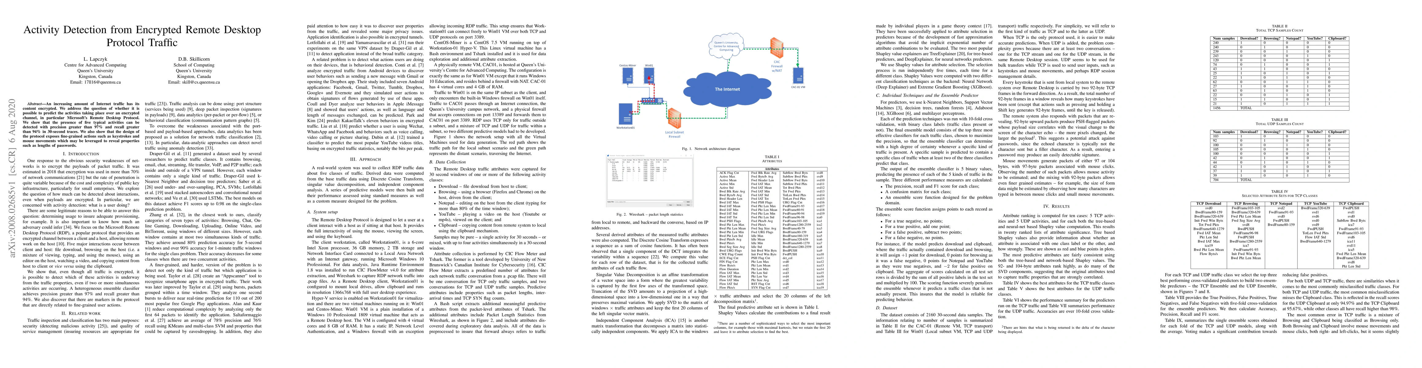 Researchers successfully detected 97%+ of typical activities over encrypted Remote Desktop Protocol traffic, including keystrokes and mouse movements, revealing sensitive user properties.