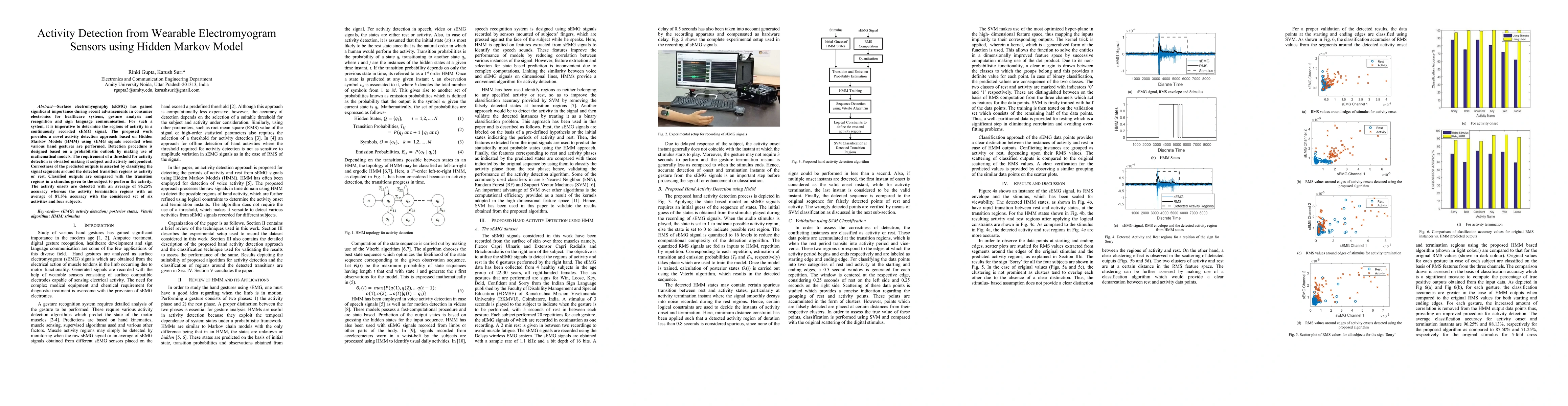 This paper proposes a Hidden Markov Model (HMM) based approach for activity detection from wearable electromyogram (sEMG) sensors, eliminating the need for threshold determination. The method achieves high accuracy in detecting activity onsets (96.25%) and terminations (87.5%) for various hand gestures, demonstrating its effectiveness in subject and activity-independent gesture recognition.