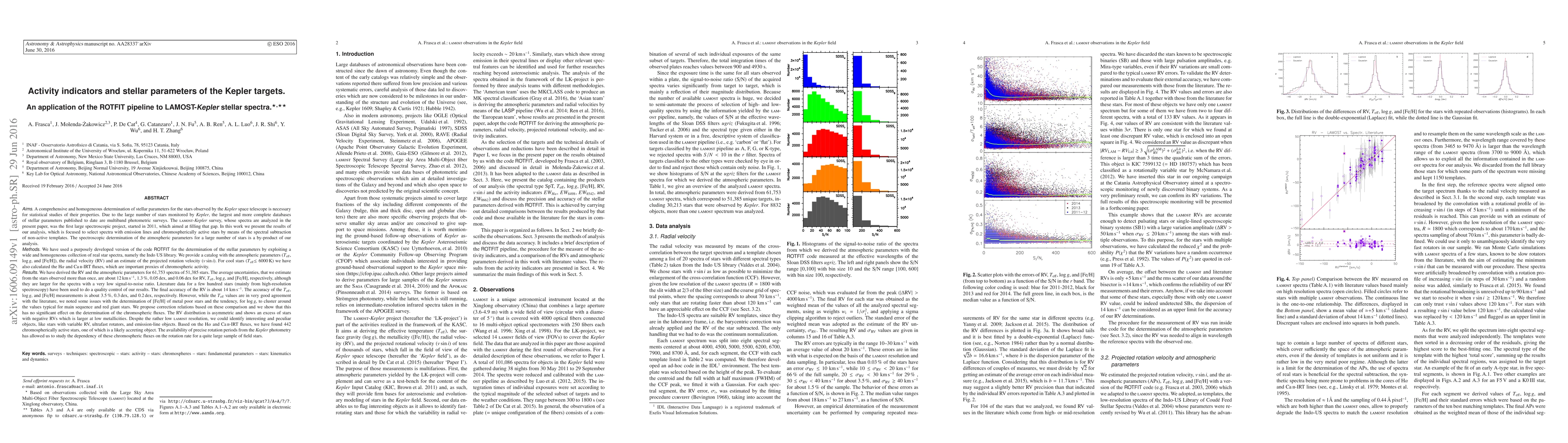 The LAMOST-Kepler survey, whose spectra are analyzed in the present paper, is the first large spectroscopic project aimed at characterizing these sources. Our work is focused at selecting emission-line objects and chromospherically active stars and on the evaluation of the atmospheric parameters. We have used a version of the code ROTFIT that exploits a wide and homogeneous collection of real star spectra, i.e. the Indo US library. We provide a catalog with the atmospheric parameters (Teff, logg, [Fe/H]), the radial velocity (RV) and an estimate of the projected rotation velocity (vsini). For cool stars (Teff<6000 K) we have also calculated the H-alpha and CaII-IRT chromospheric fluxes. We have derived the RV and the atmospheric parameters for 61,753 spectra of 51,385 stars. Literature data for a few hundred stars have been used to do a quality control of our results. The final accuracy of RV, Teff, logg, and [Fe/H] measurements is about 14 km/s, 3.5%, 0.3 dex, and 0.2 dex, respectively. However, while the Teff values are in very good agreement with the literature, we noted some issues with the determination of [Fe/H] of metal poor stars and the tendency, for logg, to cluster around the values typical for main sequence and red giant stars. We propose correction relations based on these comparison. The RV distribution is asymmetric and shows an excess of stars with negative RVs which is larger at low metallicities. We could identify stars with variable RV, ultrafast rotators, and emission-line objects. Based on the H-alpha and CaII-IRT fluxes, we have found 442 chromospherically active stars, one of which is a likely accreting object. The availability of precise rotation periods from the Kepler photometry has allowed us to study the dependency of the chromospheric fluxes on the rotation rate for a quite large sample of field stars.