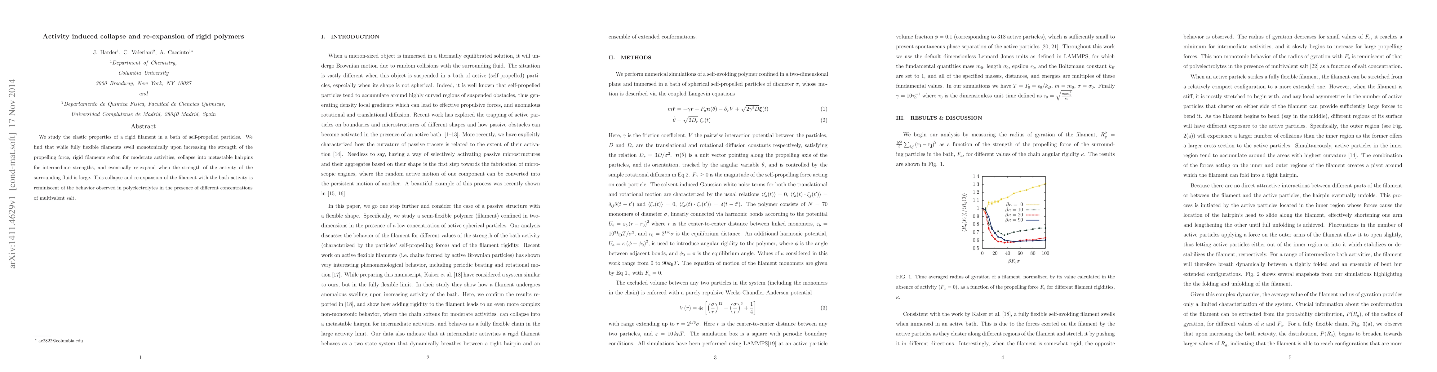 We study the elastic properties of a rigid filament in a bath of self-propelled particles. We find that while fully flexible filaments swell monotonically upon increasing the strength of the propelling force, rigid filaments soften for moderate activities, collapse into metastable hairpins for intermediate strengths, and eventually re-expand when the strength of the activity of the surrounding fluid is large. This collapse and re-expansion of the filament with the bath activity is reminiscent of the behavior observed in polyelectrolytes in the presence of different concentrations of multivalent salt.