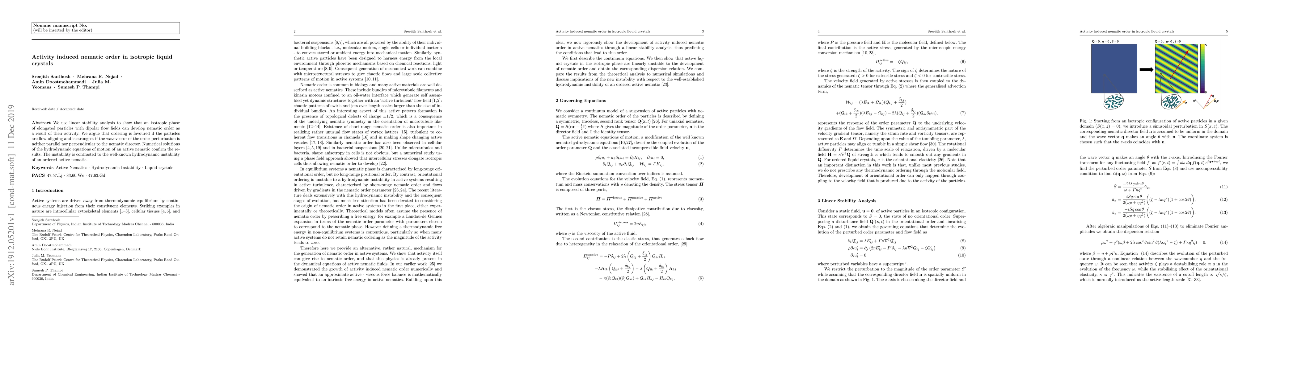 We use linear stability analysis to show that an isotropic phase of elongated particles with dipolar flow fields can develop nematic order as a result of their activity. We argue that ordering is favoured if the particles are flow-aligning and is strongest if the wavevector of the order perturbation is neither parallel nor perpendicular to the nematic director. Numerical solutions of the hydrodynamic equations of motion of an active nematic confirm the results. The instability is contrasted to the well-known hydrodynamic instability of an ordered active nematic.