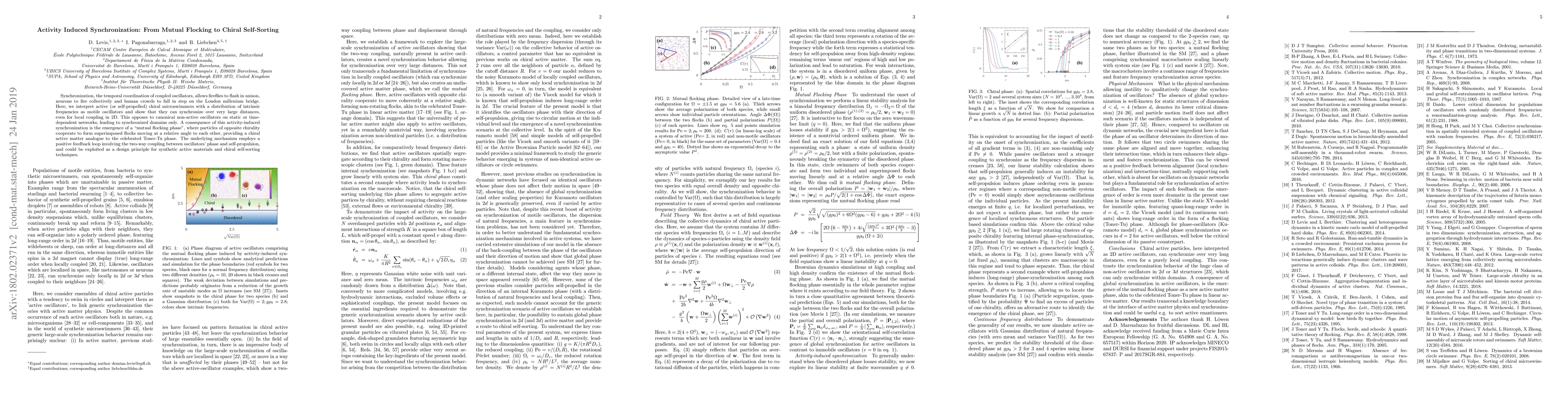 This paper explores how active chiral microswimmers can synchronize over large distances through local coupling, leading to a "mutual flocking phase" where opposite chiralities form cooperative flocks. The synchronization mechanism involves a positive feedback loop between phase and self-propulsion, offering insights for synthetic active materials and chiral self-sorting.