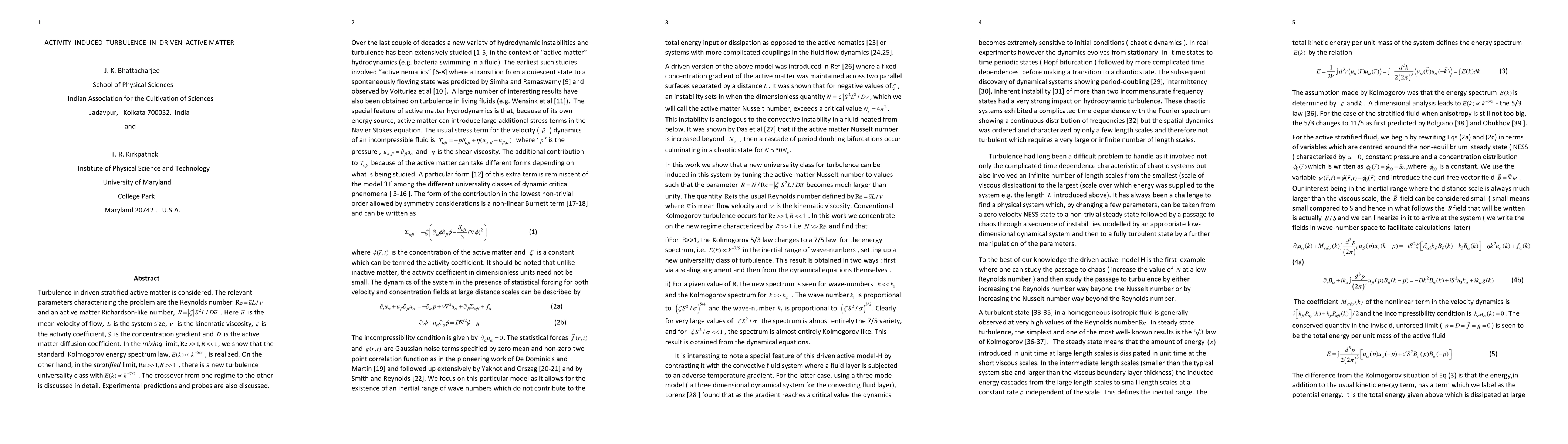 This research explores turbulence in driven stratified active matter, identifying two regimes: a mixing limit with a standard Kolmogorov energy spectrum (5/3 law) for large Re and small R, and a stratified limit with a new turbulence universality class (7/5 law) for large Re and R. The study details the crossover between these regimes and discusses experimental predictions and probes.
