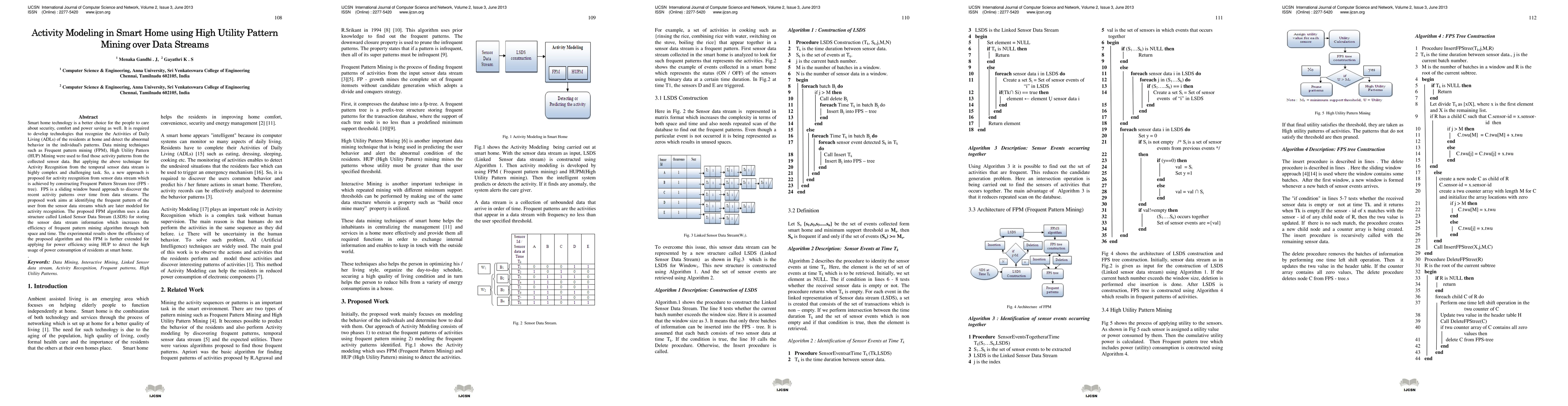 Smart home technology is a better choice for the people to care about security, comfort and power saving as well. It is required to develop technologies that recognize the Activities of Daily Living (ADLs) of the residents at home and detect the abnormal behavior in the individual's patterns. Data mining techniques such as Frequent pattern mining (FPM), High Utility Pattern (HUP) Mining were used to find those activity patterns from the collected sensor data. But applying the above technique for Activity Recognition from the temporal sensor data stream is highly complex and challenging task. So, a new approach is proposed for activity recognition from sensor data stream which is achieved by constructing Frequent Pattern Stream tree (FPS - tree). FPS is a sliding window based approach to discover the recent activity patterns over time from data streams. The proposed work aims at identifying the frequent pattern of the user from the sensor data streams which are later modeled for activity recognition. The proposed FPM algorithm uses a data structure called Linked Sensor Data Stream (LSDS) for storing the sensor data stream information which increases the efficiency of frequent pattern mining algorithm through both space and time. The experimental results show the efficiency of the proposed algorithm and this FPM is further extended for applying for power efficiency using HUP to detect the high usage of power consumption of residents at smart home.