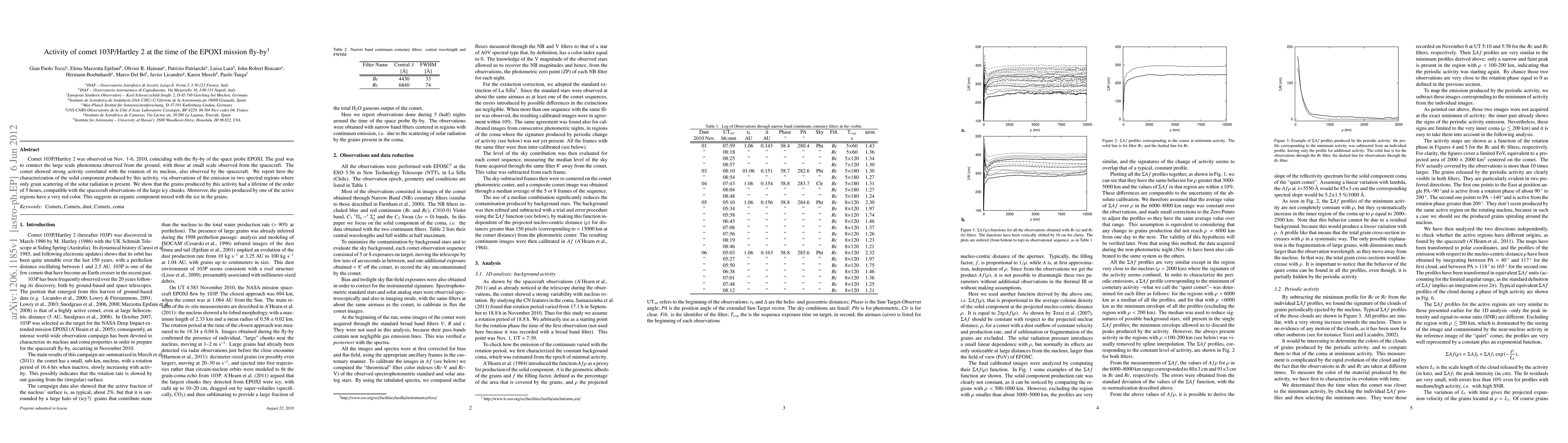 Comet 103P/Hartley~2 was observed on Nov. 1-6, 2010, coinciding with the fly-by of the space probe EPOXI. The goal was to connect the large scale phenomena observed from the ground, with those at small scale observed from the spacecraft. The comet showed strong activity correlated with the rotation of its nucleus, also observed by the spacecraft. We report here the characterization of the solid component produced by this activity, via observations of the emission in two spectral regions where only grain scattering of the solar radiation is present. We show that the grains produced by this activity had a lifetime of the order of 5 hours, compatible with the spacecraft observations of the large icy chunks. Moreover, the grains produced by one of the active regions have a very red color. This suggests an organic component mixed with the ice in the grains.