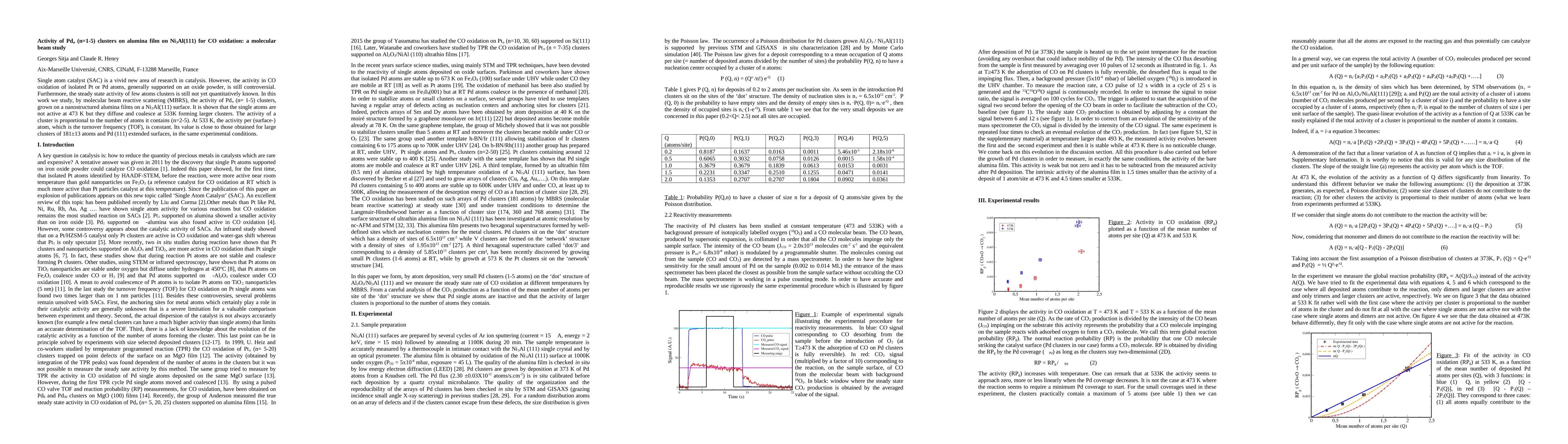 Single atom catalyst (SAC) is a vivid new area of research in catalysis. However, the activity in CO oxidation of isolated Pt or Pd atoms, generally supported on an oxide powder, is still controversial. Furthermore, the steady state activity of few atoms clusters is still not yet quantitatively known. In this work we study, by molecular beam reactive scattering (MBRS), the activity of Pd$_{\rm n}$ ($n$ = 1-5) clusters, grown on a nanostructured alumina films on a Ni$_3$Al(111) surface. It is shown that the single atoms are not active at 473 K but they diffuse and coalesce at 533K forming larger clusters. The activity of a cluster is proportional to the number of atoms it contains (n=2-5). At 533 K, the activity per (surface-) atom, which is the turnover frequency (TOF), is constant. Its value is close to those obtained for large clusters of 181$\pm$13 atoms and Pd (111) extended surfaces, in the same experimental conditions.
