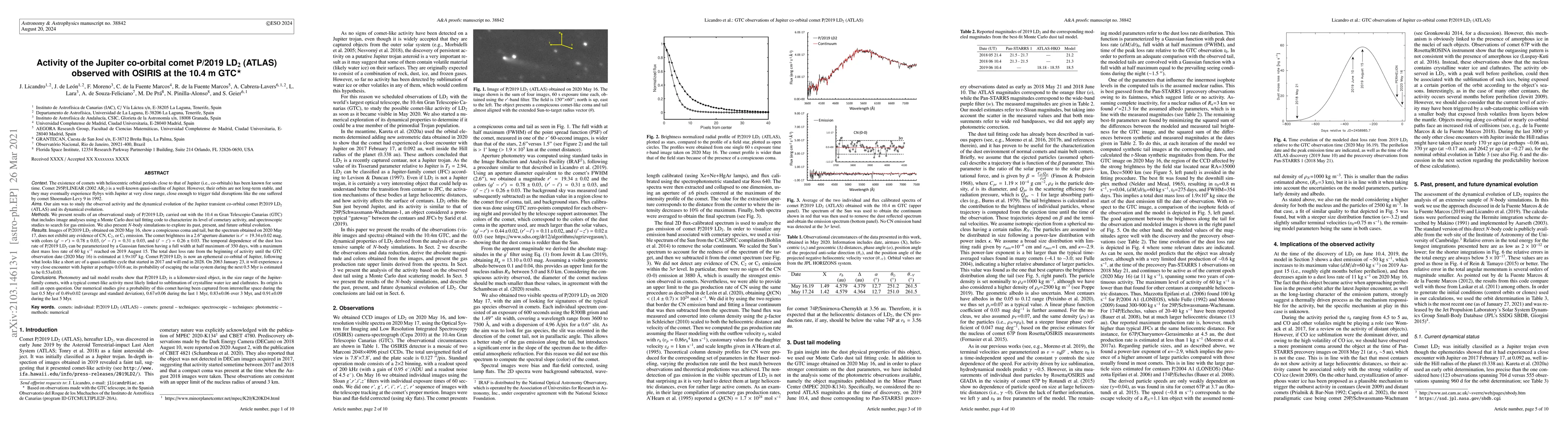 Jupiter co-orbital comets have orbits that are not long-term stable. They may experience flybys with Jupiter close enough to trigger tidal disruptions like the one suffered by comet Shoemaker-Levy 9. Our aim was to study the activity and dynamical evolution of the Jupiter co-orbital comet P/2019 LD2 (ATLAS). We present results of an observational study carried out with the 10.4m Gran Telescopio Canarias (GTC) that includes image analyses using a MC dust tail fitting code to characterize its activity, and spectroscopic studies to search for gas emission. We also present N-body simulations to explore its orbital evolution. Images of LD2 obtained on 2020 May 16 show a conspicuous coma and tail. The spectrum does not exhibit any evidence of CN, C2, or C3 emission. The comet brightness in a 2.6 arcsec aperture is r'=19.34+/-0.02 mag, with colors (g'-r')=0.78+/-0.03, (r'-i')=0.31+/-0.03, and (i'-z')=0.26+/-0.03. The temporal dependence of the dust loss rate can be parameterized by a Gaussian having a FWHM of 350 days and a maximum of 60 kg/s reached on 2019 August 15. The total dust loss rate is 1.9e09 kg. LD2 is now following what looks like a short arc of a quasi-satellite cycle that started in 2017 and will end in 2028. On 2063 January 23, it will experience a very close encounter with Jupiter at 0.016 au. Its probability of escaping the solar system during the next 0.5 Myr is 0.53+/-0.03. LD2 is a kilometer-sized object, in the size range of the Jupiter-family comets, with a typical comet-like activity likely linked to sublimation of crystalline water ice and clathrates. Its origin is still an open question. We report a probability of LD2 having been captured from interstellar space during the last 0.5 Myr of 0.49+/-0.02, 0.67+/-0.06 during the last 1 Myr, 0.83+/-0.06 over 3 Myr, and 0.91+/-0.09 during the last 5 Myr.