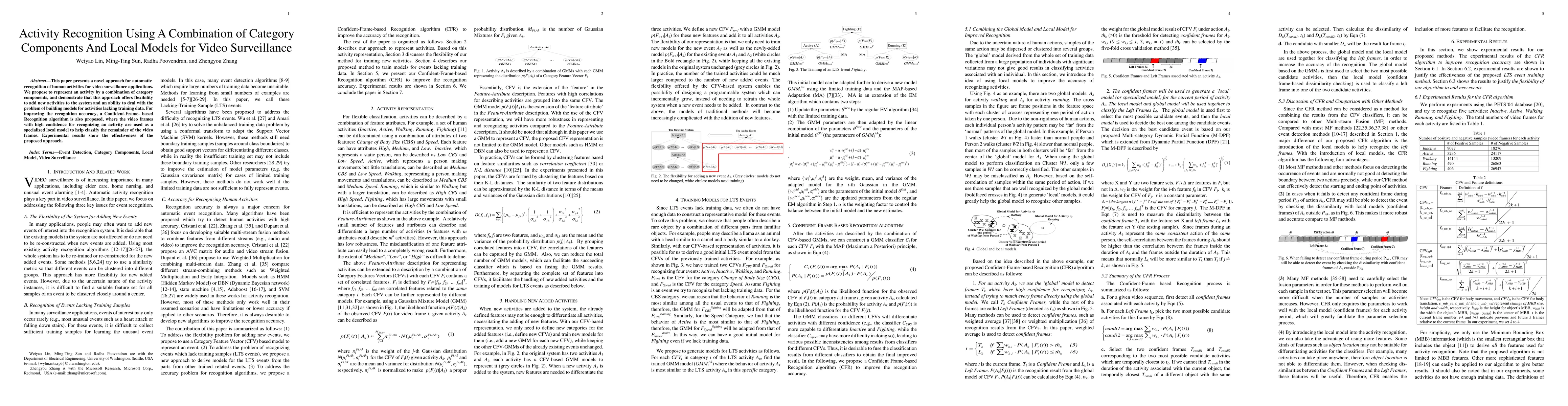 This paper presents a novel approach for automatic recognition of human activities for video surveillance applications. We propose to represent an activity by a combination of category components, and demonstrate that this approach offers flexibility to add new activities to the system and an ability to deal with the problem of building models for activities lacking training data. For improving the recognition accuracy, a Confident-Frame- based Recognition algorithm is also proposed, where the video frames with high confidence for recognizing an activity are used as a specialized local model to help classify the remainder of the video frames. Experimental results show the effectiveness of the proposed approach.