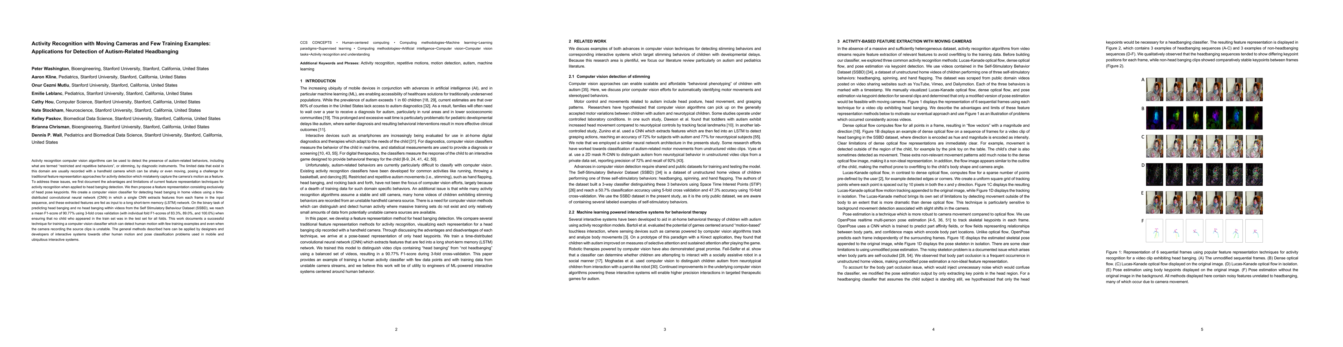 Activity recognition computer vision algorithms can be used to detect the presence of autism-related behaviors, including what are termed "restricted and repetitive behaviors", or stimming, by diagnostic instruments. The limited data that exist in this domain are usually recorded with a handheld camera which can be shaky or even moving, posing a challenge for traditional feature representation approaches for activity detection which mistakenly capture the camera's motion as a feature. To address these issues, we first document the advantages and limitations of current feature representation techniques for activity recognition when applied to head banging detection. We then propose a feature representation consisting exclusively of head pose keypoints. We create a computer vision classifier for detecting head banging in home videos using a time-distributed convolutional neural network (CNN) in which a single CNN extracts features from each frame in the input sequence, and these extracted features are fed as input to a long short-term memory (LSTM) network. On the binary task of predicting head banging and no head banging within videos from the Self Stimulatory Behaviour Dataset (SSBD), we reach a mean F1-score of 90.77% using 3-fold cross validation (with individual fold F1-scores of 83.3%, 89.0%, and 100.0%) when ensuring that no child who appeared in the train set was in the test set for all folds. This work documents a successful technique for training a computer vision classifier which can detect human motion with few training examples and even when the camera recording the source clips is unstable. The general methods described here can be applied by designers and developers of interactive systems towards other human motion and pose classification problems used in mobile and ubiquitous interactive systems.