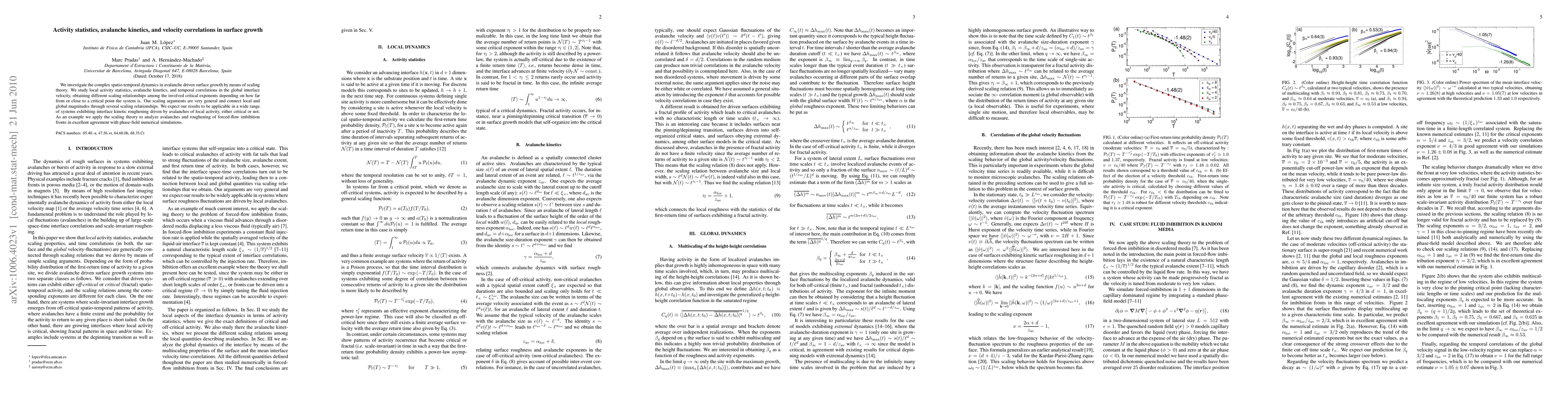 This paper explores the scaling theory of spatio-temporal dynamics in avalanche-driven surface growth, focusing on local activity statistics, avalanche kinetics, and velocity correlations. It reveals distinct scaling relationships for critical and non-critical systems, with results applicable to a variety of kinetic roughening processes, demonstrated through forced-flow imbibition fronts.