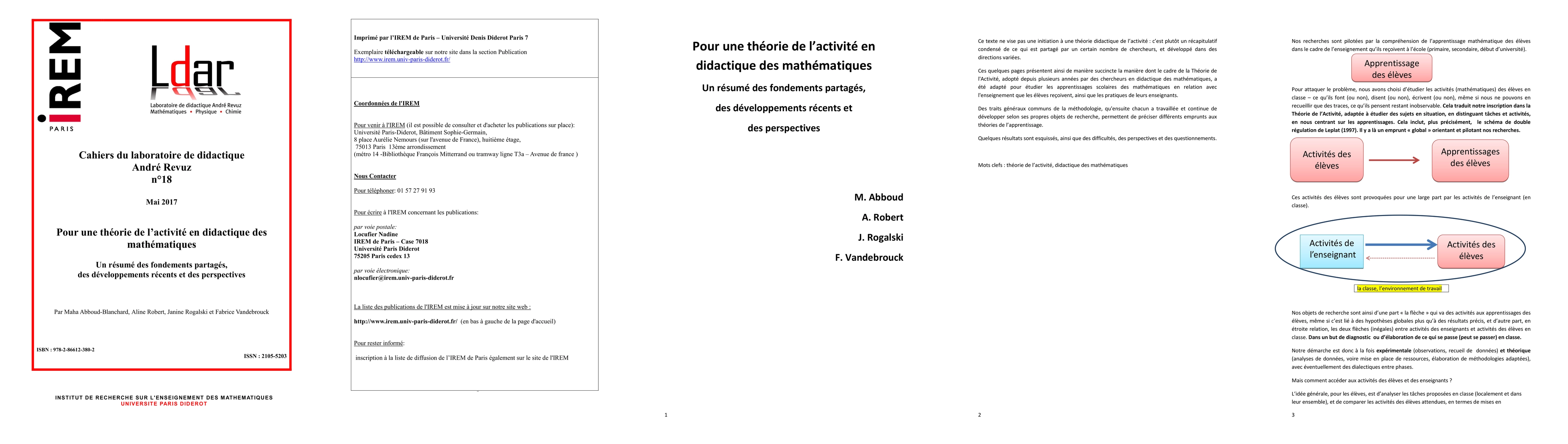 These few pages briefly present the way in which Activity Theory has been adopted for several years now by French researchers in didactics of mathematics and has been adapted to study the learning of school mathematics in relation with the teaching that students receive, as well as teachers practices. Common general features of the methodology that each one afterwards worked on and continues to develop according to his own research objects, make it possible to specify some principles deriving from well-known learningTheories. Some results are outlined, as well as difficulties and perspectives.