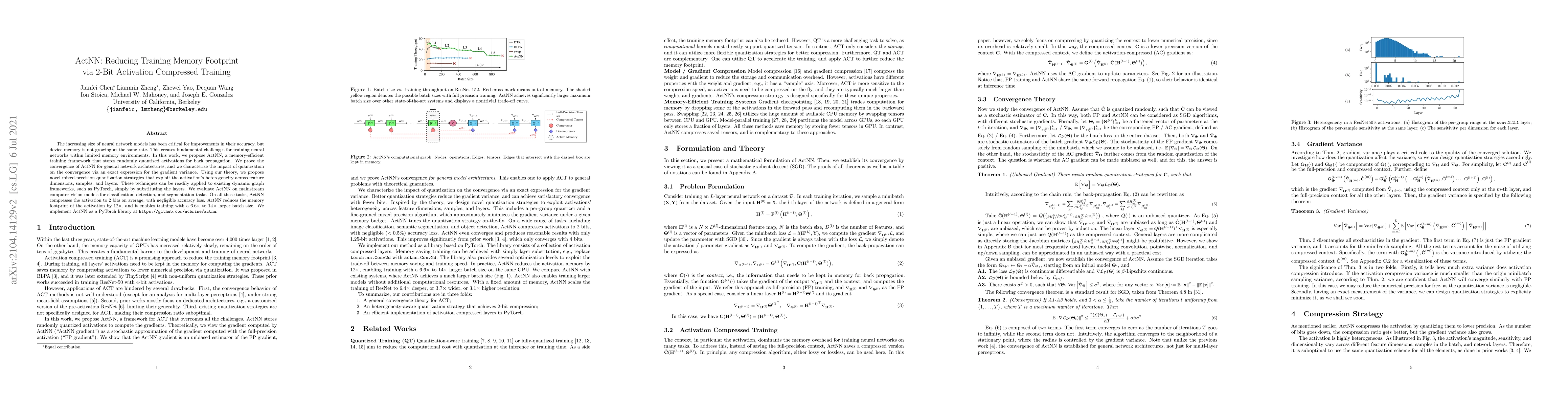 ActNN proposes a memory-efficient training framework that uses 2-bit activation quantization to significantly reduce training memory footprint with minimal loss in accuracy. The method leverages mixed-precision quantization strategies and enables training with larger batch sizes, evaluated on various computer vision tasks.