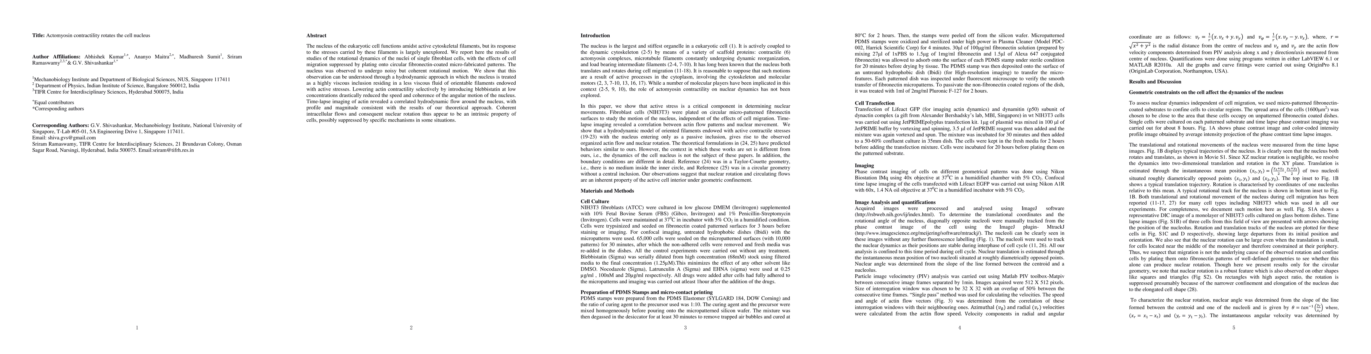This study reveals that the nucleus in fibroblast cells rotates due to actomyosin contractility, with the rotational speed varying based on cell geometry. Reducing actin contractility with blebbistatin significantly decreases nuclear rotational motion, indicating a critical role of active cytoskeletal stresses in maintaining nuclear dynamics.