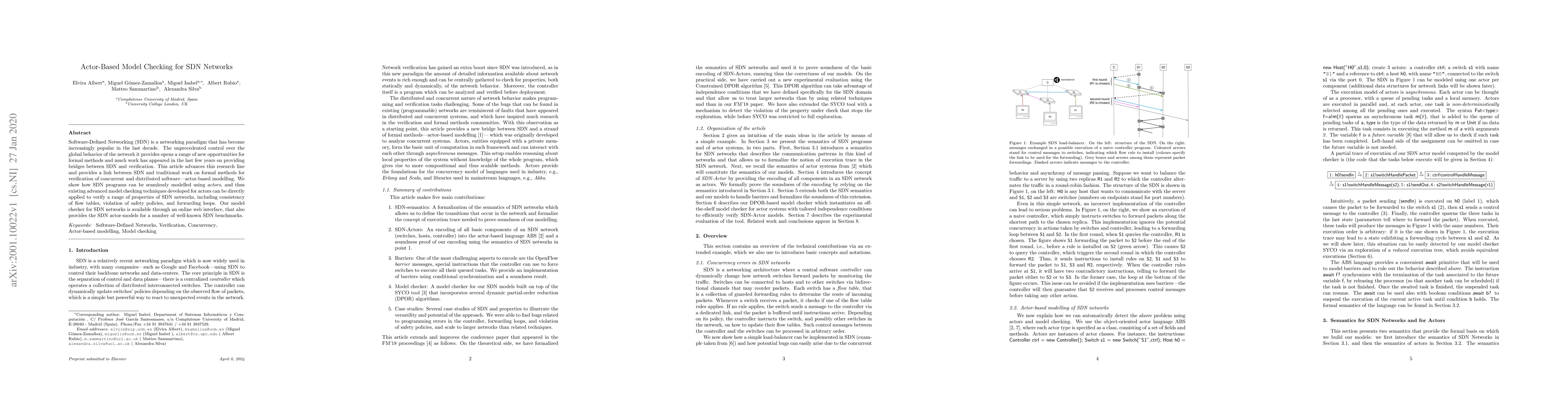 This paper proposes a method to model Software-Defined Networking (SDN) using actor-based modelling, enabling the application of existing model checking techniques to verify properties like flow table consistency and safety policy violations. The authors provide an online model checker interface with actor-models for SDN benchmarks.