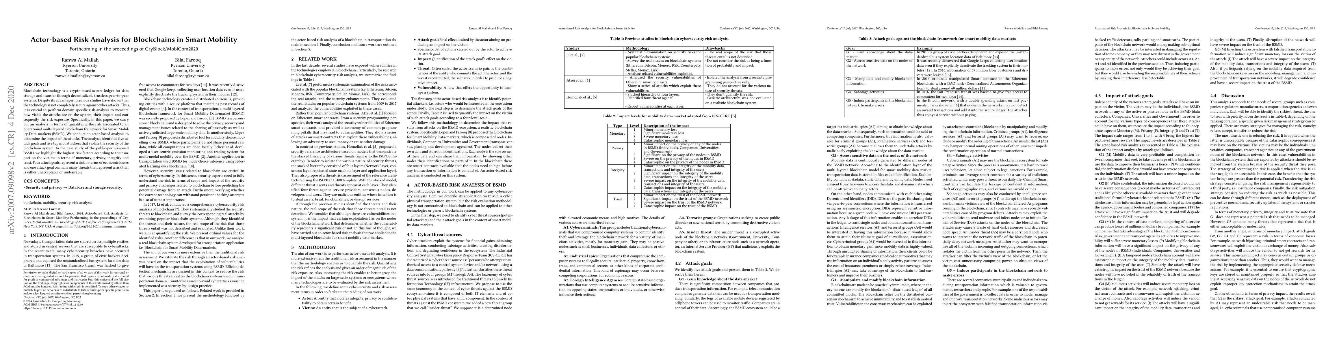 This paper conducts an actor-based risk analysis for blockchain systems in smart mobility, focusing on a multi-layered framework for Smart Mobility Data-markets (BSMD). It identifies five attack goals and types of attackers, highlighting the highest risk factors in terms of economic, privacy, integrity, and trust impacts.