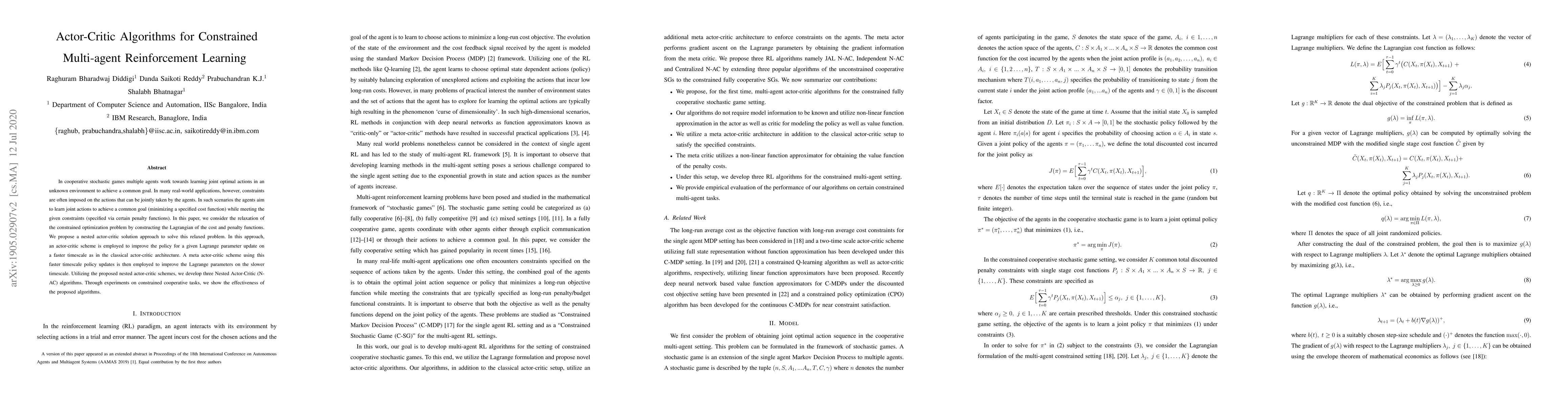 This paper proposes nested actor-critic algorithms to solve constrained multi-agent reinforcement learning problems by relaxing the optimization problem using Lagrangian methods. The developed N-AC algorithms demonstrate effectiveness in achieving common goals while adhering to imposed constraints.