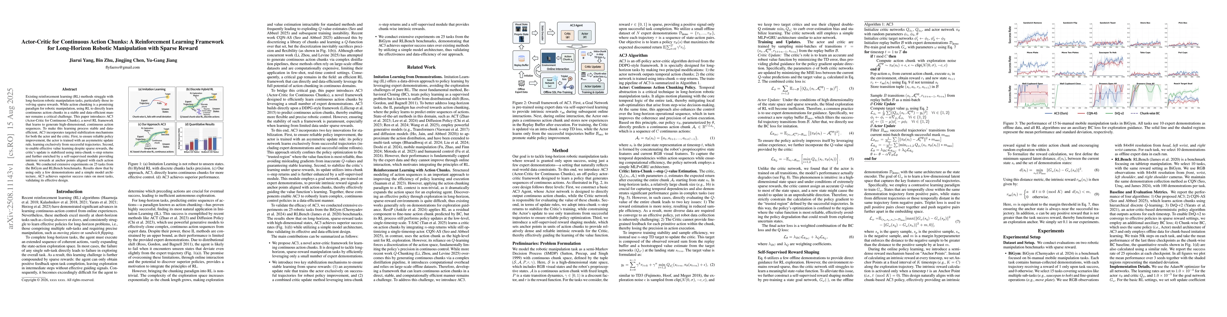 Existing reinforcement learning (RL) methods struggle with long-horizon robotic manipulation tasks, particularly those involving sparse rewards. While action chunking is a promising paradigm for robotic manipulation, using RL to directly learn continuous action chunks in a stable and data-efficient manner remains a critical challenge. This paper introduces AC3 (Actor-Critic for Continuous Chunks), a novel RL framework that learns to generate high-dimensional, continuous action sequences. To make this learning process stable and data-efficient, AC3 incorporates targeted stabilization mechanisms for both the actor and the critic. First, to ensure reliable policy improvement, the actor is trained with an asymmetric update rule, learning exclusively from successful trajectories. Second, to enable effective value learning despite sparse rewards, the critic's update is stabilized using intra-chunk $n$-step returns and further enriched by a self-supervised module providing intrinsic rewards at anchor points aligned with each action chunk. We conducted extensive experiments on 25 tasks from the BiGym and RLBench benchmarks. Results show that by using only a few demonstrations and a simple model architecture, AC3 achieves superior success rates on most tasks, validating its effective design.
