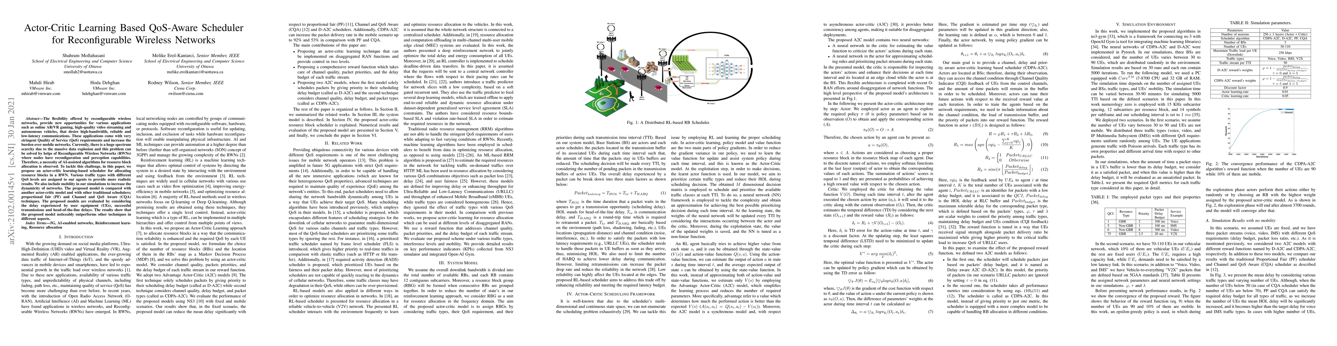This paper proposes an actor-critic learning-based scheduler for resource block allocation in reconfigurable wireless networks, aiming to meet stringent QoS requirements for applications like AR/VR gaming and autonomous vehicles. The model outperforms traditional schedulers in terms of delay, successful transmissions, and head-of-the-line delays.