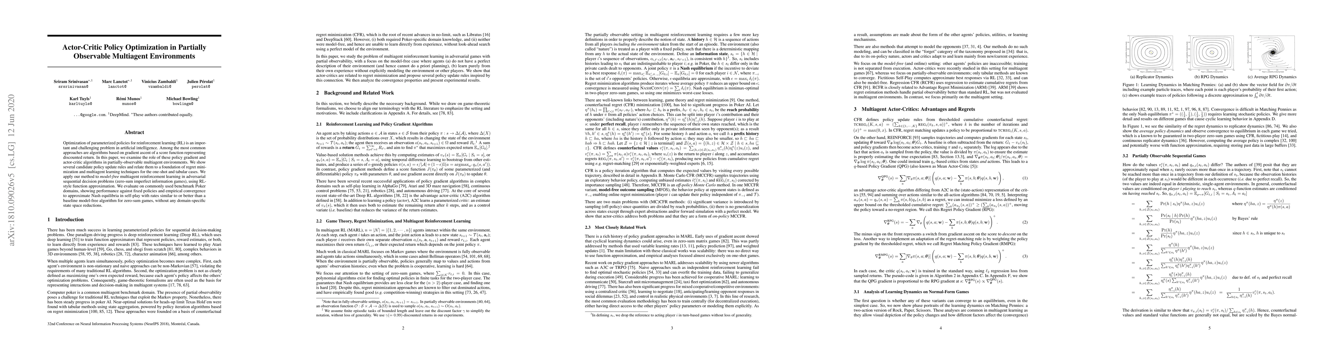 This paper explores actor-critic policy optimization for reinforcement learning in partially observable multiagent environments, presenting new policy update rules with convergence guarantees. It demonstrates performance on Poker domains, achieving competitive results against fixed policies and approximating Nash equilibria.