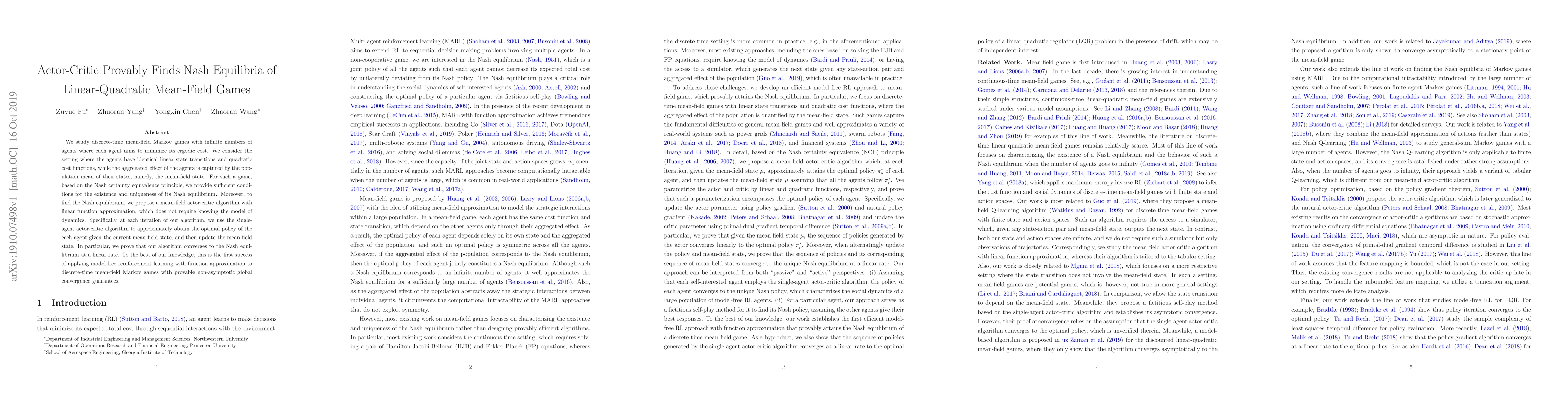 This paper studies linear-quadratic mean-field games with infinite agents, proposing a mean-field actor-critic algorithm to find the Nash equilibrium without requiring a known dynamics model. The algorithm is shown to converge linearly to the equilibrium, marking the first model-free reinforcement learning approach with such guarantees for this setting.