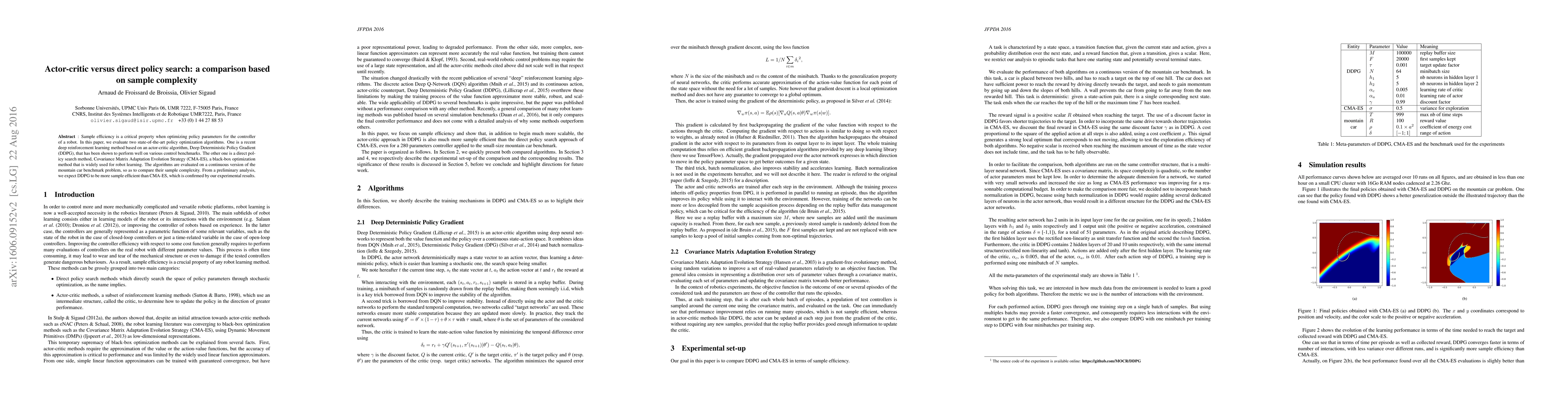 Sample efficiency is a critical property when optimizing policy parameters for the controller of a robot. In this paper, we evaluate two state-of-the-art policy optimization algorithms. One is a recent deep reinforcement learning method based on an actor-critic algorithm, Deep Deterministic Policy Gradient (DDPG), that has been shown to perform well on various control benchmarks. The other one is a direct policy search method, Covariance Matrix Adaptation Evolution Strategy (CMA-ES), a black-box optimization method that is widely used for robot learning. The algorithms are evaluated on a continuous version of the mountain car benchmark problem, so as to compare their sample complexity. From a preliminary analysis, we expect DDPG to be more sample efficient than CMA-ES, which is confirmed by our experimental results.