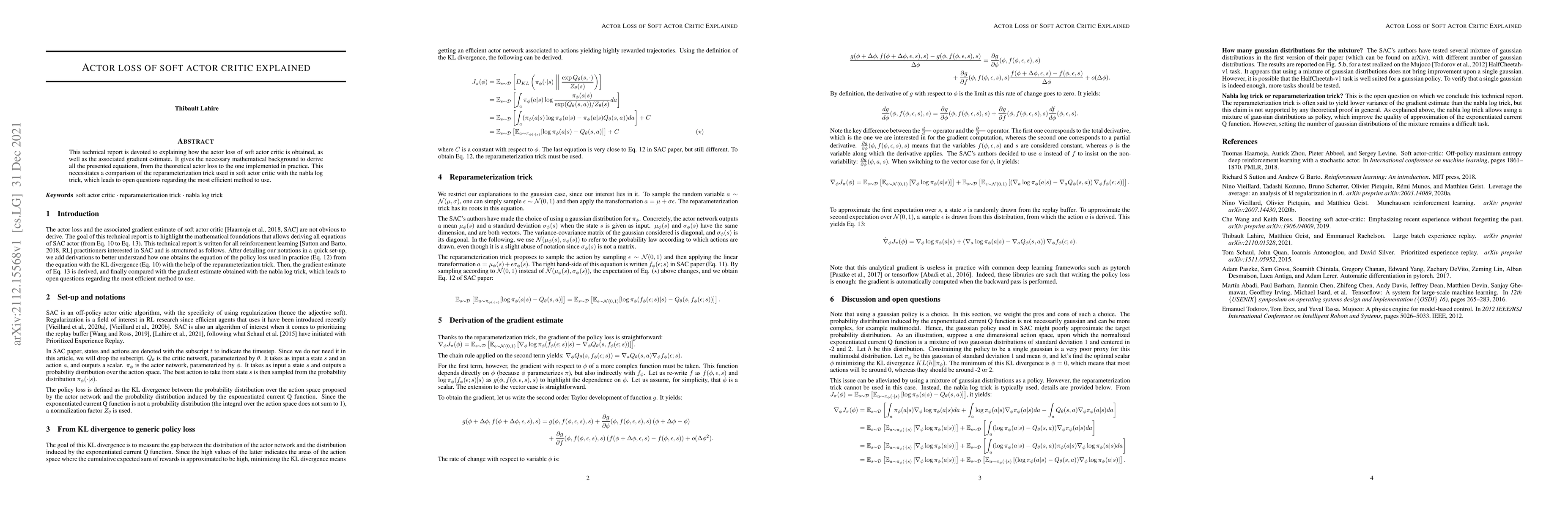 This technical report is devoted to explaining how the actor loss of soft actor critic is obtained, as well as the associated gradient estimate. It gives the necessary mathematical background to derive all the presented equations, from the theoretical actor loss to the one implemented in practice. This necessitates a comparison of the reparameterization trick used in soft actor critic with the nabla log trick, which leads to open questions regarding the most efficient method to use.