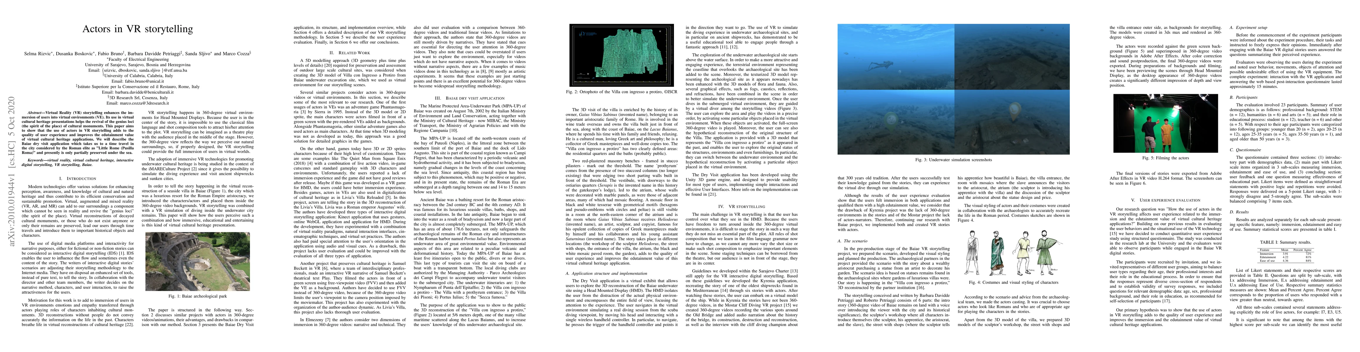 Virtual Reality (VR) storytelling enhances the immersion of users into virtual environments (VE). Its use in virtual cultural heritage presentations helps the revival of the genius loci (the spirit of the place) of cultural monuments. This paper aims to show that the use of actors in VR storytelling adds to the quality of user experience and improves the edutainment value of virtual cultural heritage applications. We will describe the Baiae dry visit application which takes us to a time travel in the city considered by the Roman elite as "Little Rome (Pusilla Roma)" and presently is only partially preserved under the sea.