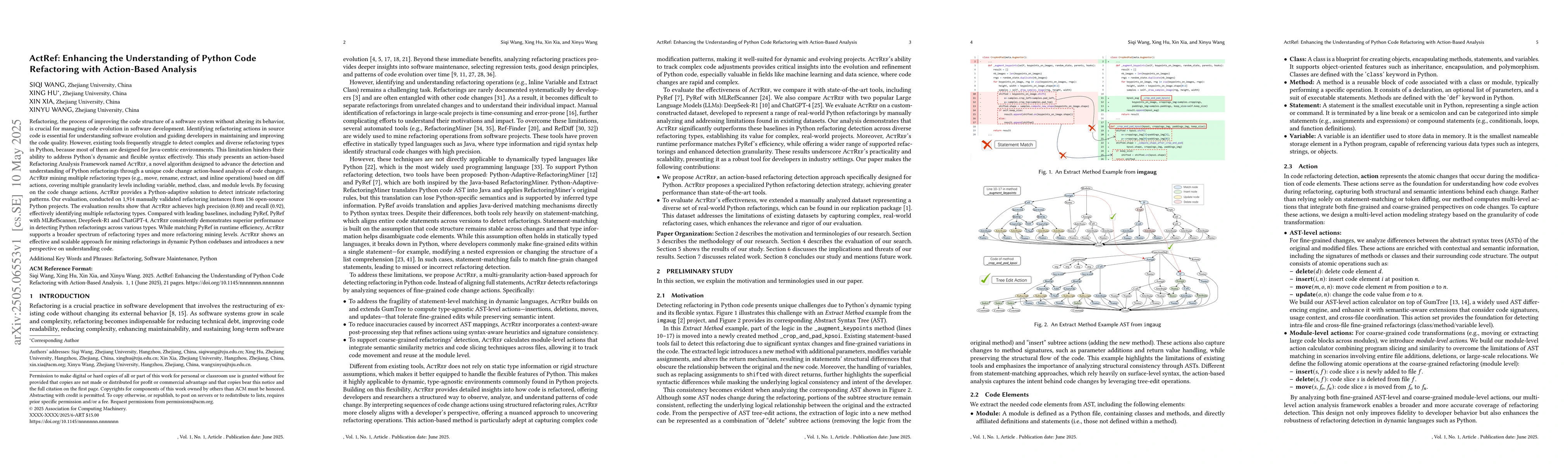 A new framework called ActRef is introduced to analyze Python code refactoring by examining changes made to the codebase, achieving high precision and recall in detecting various refactorings types.