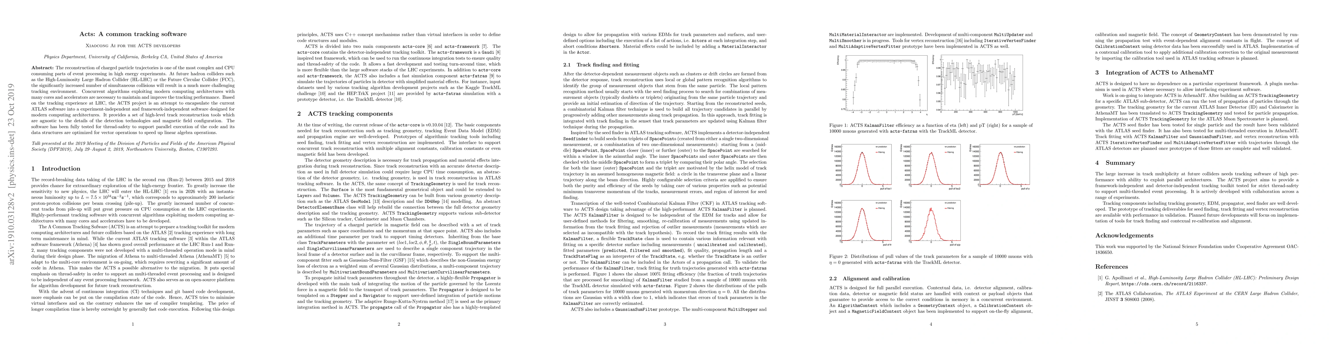 The reconstruction of charged particle trajectories is one of the most complex and CPU consuming parts of event processing in high energy experiments. At future hadron colliders such as the High-Luminosity Large Hadron Collider (HL-LHC) or the Future Circular Collider (FCC), the significantly increased number of simultaneous collisions will result in a much more challenging tracking environment. Concurrent algorithms exploiting modern computing architectures with many cores and accelerators are necessary to maintain and improve the tracking performance. Based on the tracking experience at LHC, the ACTS project is an attempt to encapsulate the current ATLAS software into a experiment-independent and framework-independent software designed for modern computing architectures. It provides a set of high-level track reconstruction tools which are agnostic to the details of the detection technologies and magnetic field configuration. The software has been fully tested for thread-safety to support parallel execution of the code and its data structures are optimized for vector operations to speed up linear algebra operations.