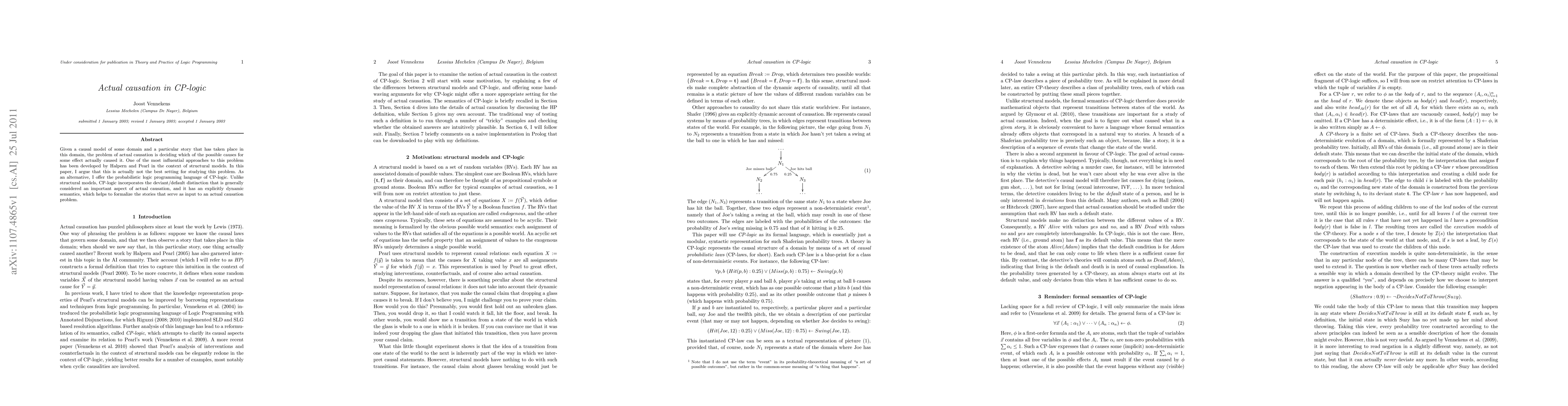Given a causal model of some domain and a particular story that has taken place in this domain, the problem of actual causation is deciding which of the possible causes for some effect actually caused it. One of the most influential approaches to this problem has been developed by Halpern and Pearl in the context of structural models. In this paper, I argue that this is actually not the best setting for studying this problem. As an alternative, I offer the probabilistic logic programming language of CP-logic. Unlike structural models, CP-logic incorporates the deviant/default distinction that is generally considered an important aspect of actual causation, and it has an explicitly dynamic semantics, which helps to formalize the stories that serve as input to an actual causation problem.