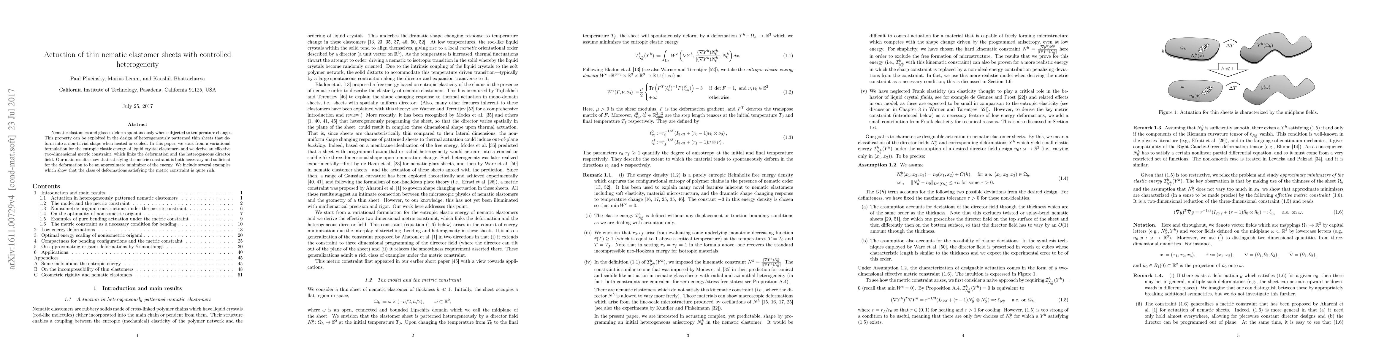 This paper explores the actuation of thin nematic elastomer sheets with controlled heterogeneity, deriving a metric constraint that links deformation to the heterogeneous director field. The study demonstrates that satisfying the metric constraint is necessary and sufficient for deformation to minimize energy, showcasing a variety of deformation examples.