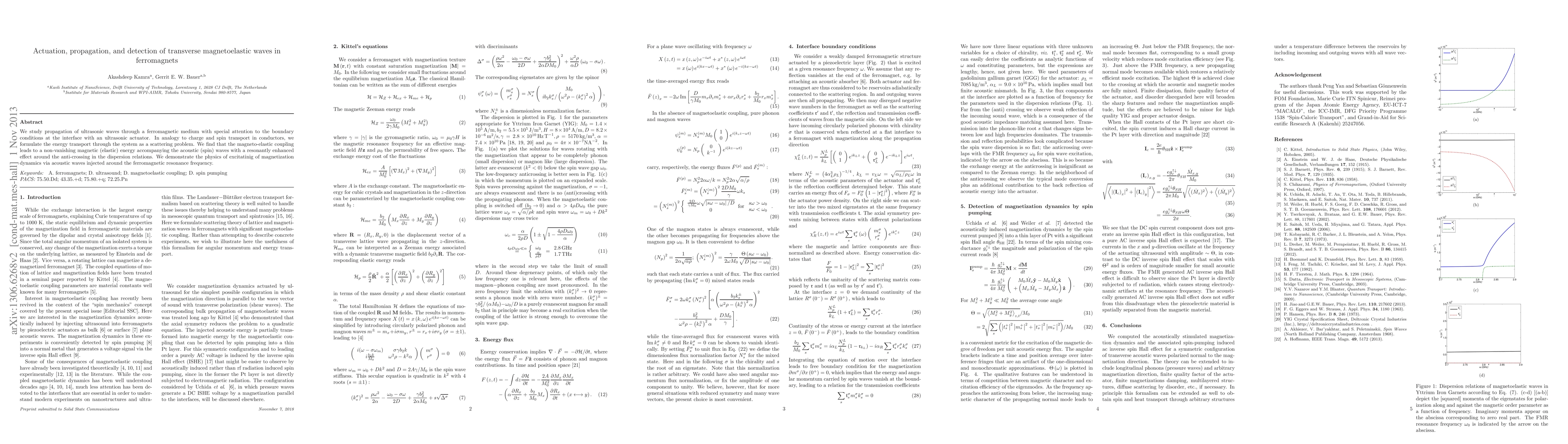 We study propagation of ultrasonic waves through a ferromagnetic medium with special attention to the boundary conditions at the interface with an ultrasonic actuator. In analogy to charge and spin transport in conductors, we formulate the energy transport through the system as a scattering problem. We find that the magneto-elastic coupling leads to a non-vanishing magnetic (elastic) energy accompanying the acoustic (spin) waves with a resonantly enhanced effect around the dispersion relation anti-crossing point. We demonstrate the physics of excitation of magnetization dynamics via acoustic waves injection around the ferromagnetic resonance frequency.