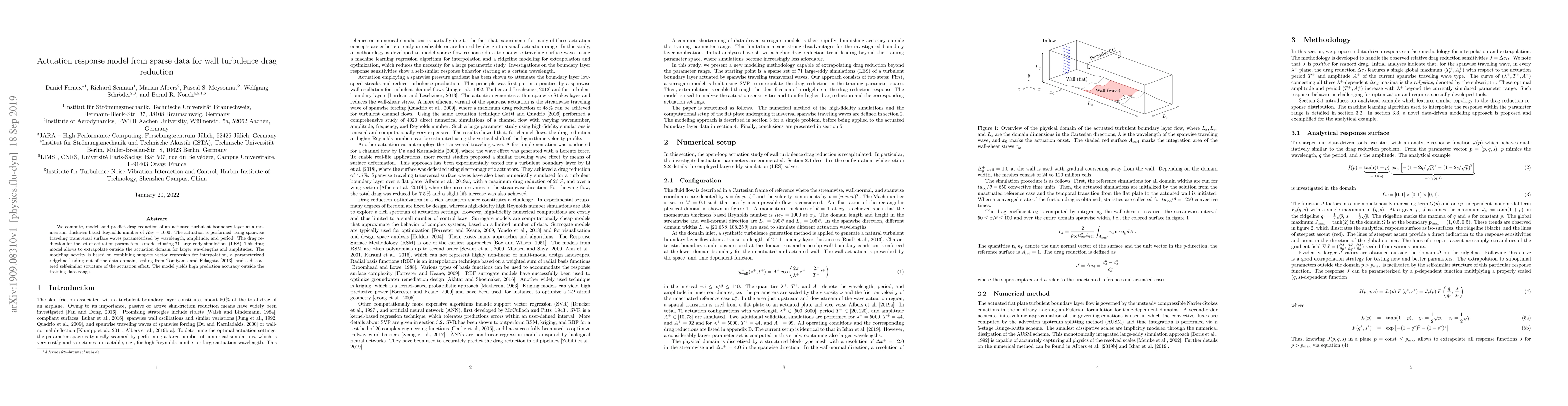 We compute, model, and predict drag reduction of an actuated turbulent boundary layer at a momentum thickness based Reynolds number of Re{\theta} = 1000. The actuation is performed using spanwise traveling transversal surface waves parameterized by wavelength, amplitude, and period. The drag reduction for the set of actuation parameters is modeled using 71 large-eddy simulations (LES). This drag model allows to extrapolate outside the actuation domain for larger wavelengths and amplitudes. The modeling novelty is based on combining support vector regression for interpolation, a parameterized ridgeline leading out of the data domain, scaling from Tomiyama and Fukagata (2013), and a discovered self-similar structure of the actuation effect. The model yields high prediction accuracy outside the training data range.