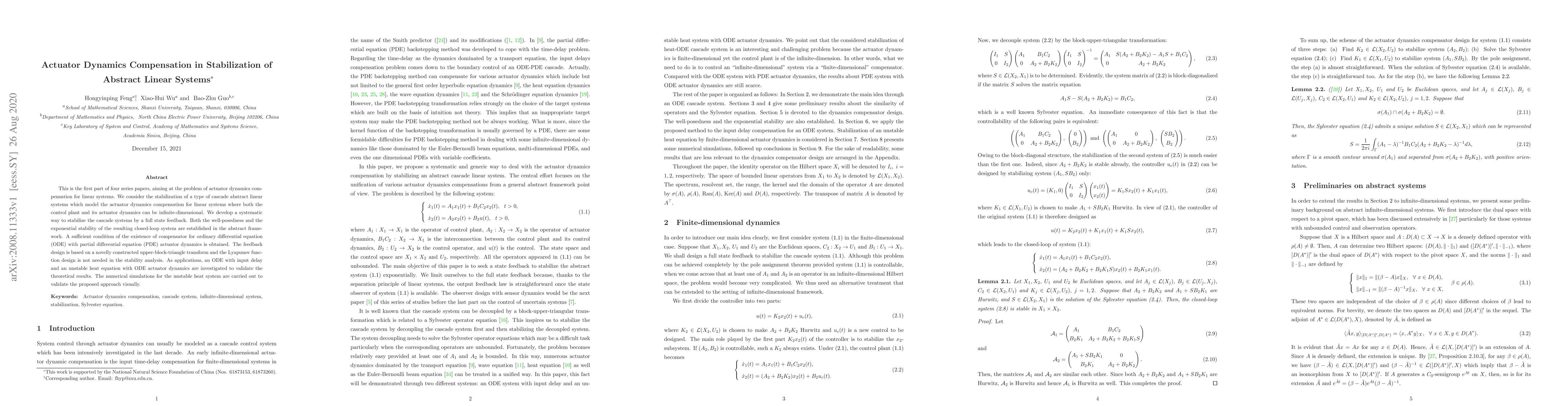 This paper develops a systematic approach to stabilize abstract linear systems with infinite-dimensional actuator dynamics using full state feedback, establishing the existence of compensators for ODEs with PDE actuator dynamics.