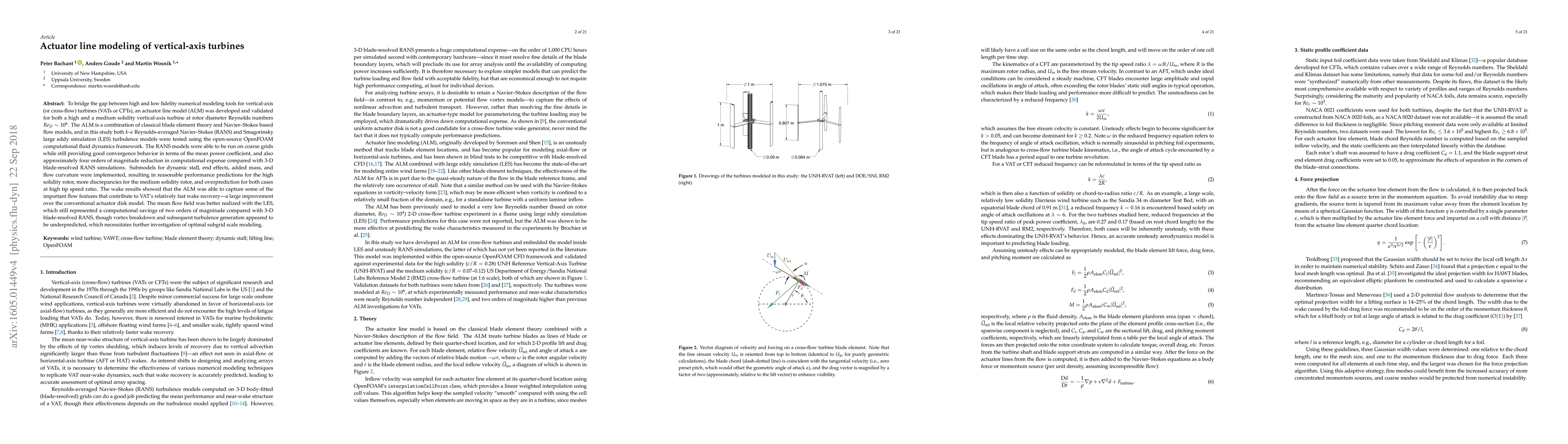 This study develops an actuator line model (ALM) to bridge high and low fidelity models for vertical-axis turbines, showing good performance predictions for high solidity rotors, but discrepancies for medium solidity rotors. The ALM provides significant computational savings compared to 3-D blade-resolved simulations, capturing important wake features and flow dynamics.