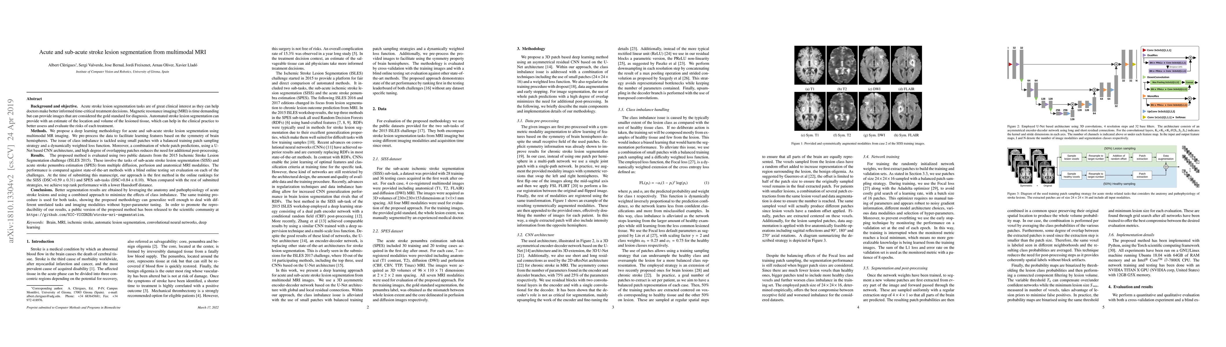 This paper presents a deep learning method for segmenting acute and sub-acute stroke lesions using multimodal MRI, achieving top-ranked performance in the ISLES 2015 challenge. The method generalizes well across different tasks and modalities without requiring hyperparameter tuning.