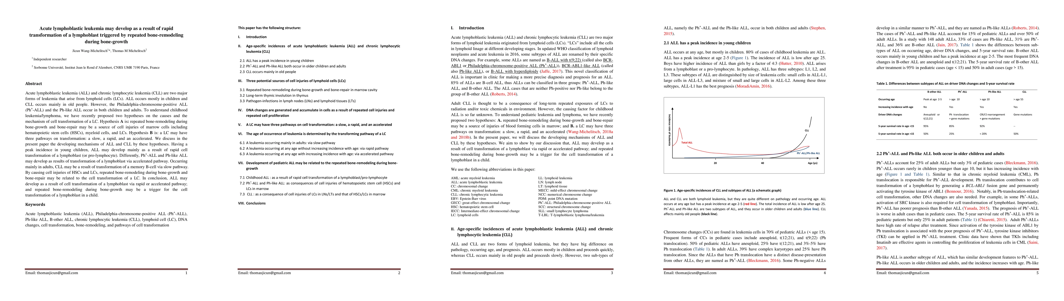 This paper proposes that acute lymphoblastic leukemia (ALL) in children primarily arises from the rapid transformation of lymphoblasts triggered by repeated bone-remodeling during bone growth, while chronic lymphocytic leukemia (CLL) in adults results from the slow transformation of memory B-cells.