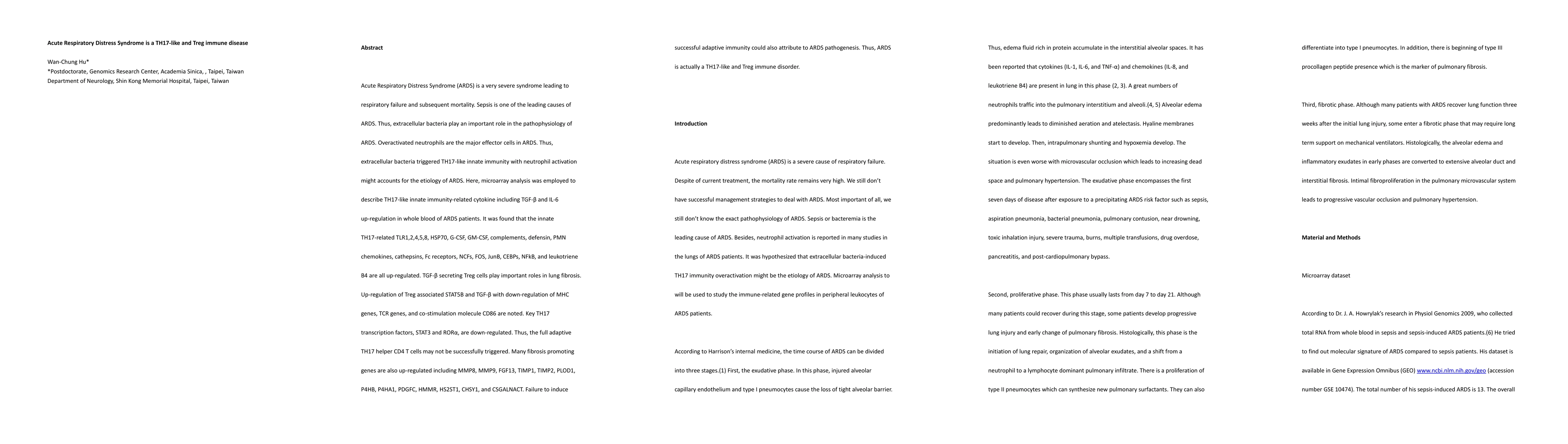 Acute Respiratory Distress Syndrome (ARDS) is a very severe syndrome leading to respiratory failure and subsequent mortality. Sepsis is one of the leading causes of ARDS. Thus, extracellular bacteria play an important role in the pathophysiology of ARDS. Overactivated neutrophils are the major effector cells in ARDS. Thus, extracellular bacteria triggered TH17-like innate immunity with neutrophil activation might accounts for the etiology of ARDS. Here, microarray analysis was employed to describe TH17-like innate immunity-related cytokine including TGF-{\beta} and IL-6 up-regulation in whole blood of ARDS patients. It was found that the innate TH17-related TLR1,2,4,5,8, HSP70, G-CSF, GM-CSF, complements, defensin, PMN chemokines, cathepsins, Fc receptors, NCFs, FOS, JunB, CEBPs, NFkB, and leukotriene B4 are all up-regulated. TGF-{\beta} secreting Treg cells play important roles in lung fibrosis. Up-regulation of Treg associated STAT5B and TGF-{\beta} with down-regulation of MHC genes, TCR genes, and co-stimulation molecule CD86 are noted. Key TH17 transcription factors, STAT3 and ROR{\alpha}, are down-regulated. Thus, the full adaptive TH17 helper CD4 T cells may not be successfully triggered. Many fibrosis promoting genes are also up-regulated including MMP8, MMP9, FGF13, TIMP1, TIMP2, PLOD1, P4HB, P4HA1, PDGFC, HMMR, HS2ST1, CHSY1, and CSGALNACT. Failure to induce successful adaptive immunity could also attribute to ARDS pathogenesis. Thus, ARDS is actually a TH17-like and Treg immune disorder.